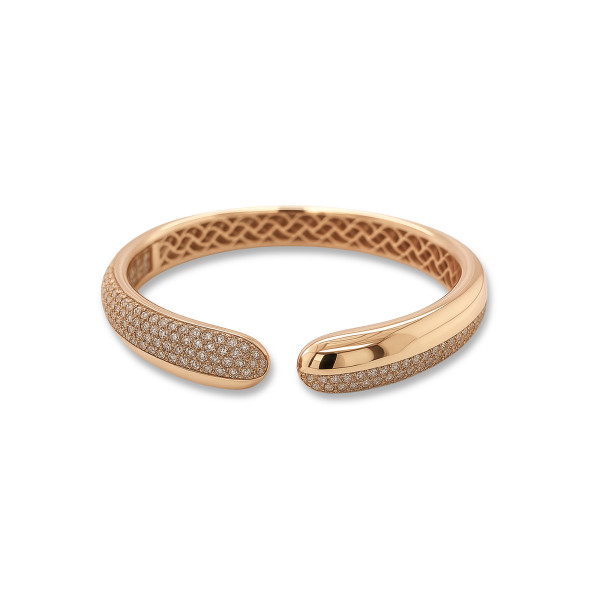 Seine Oberfläche ist mit 120 erlesenen braunen Diamanten besetzt, die in ihrer warmen Farbnuance an das Glühen erloschener Glut erinnern. Mit einem Gesamtgewicht von 3,9 Karat entfaltet der Armreif ein faszinierendes Lichtspiel aus Tiefe und Wärme – luxuriös, sinnlich und unverkennbar individuell.