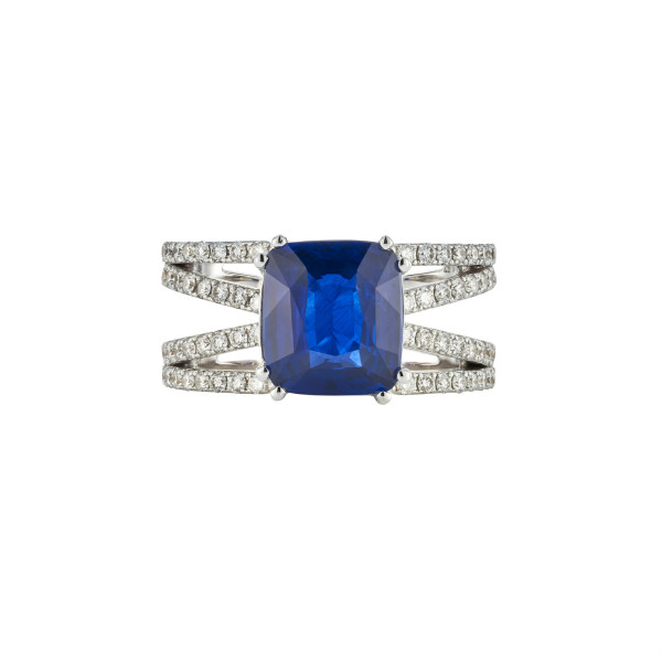 Im Zentrum steht ein außergewöhnlicher Ceylon Saphir im Kissenschliff mit einem Gewicht von 3,83 Karat. Seine lebendige, tiefblaue Farbe mit der für Ceylon-Saphire typischen Leuchtkraft verleiht dem Ring eine besondere Strahlkraft und Eleganz. Der Kissenschliff verbindet weiche Konturen mit intensiver Brillanz und unterstreicht die natürliche Schönheit des Edelsteins auf harmonische Weise.