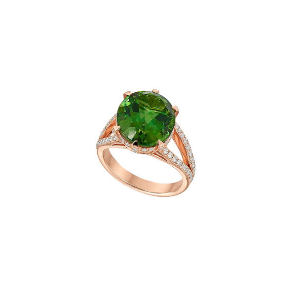 Im Mittelpunkt steht ein eindrucksvoller grüner Turmalin im Ovalschliff mit einem Gewicht von 13,27 Karat. Seine intensive, tiefgrüne Farbe mit lebendiger Brillanz verleiht dem Ring eine besondere Präsenz und macht ihn zu einem echten Blickfang. Der Ovalschliff bringt die Farbintensität und Tiefe des Edelsteins optimal zur Geltung und sorgt für ein harmonisches, elegantes Erscheinungsbild.