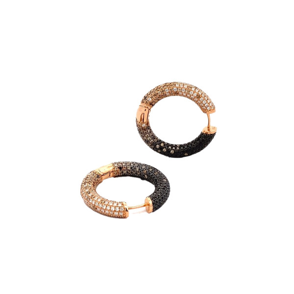 In meisterlicher Präzision wurden 206 feinweiße Diamanten (G) mit kleinen Einschlüssen und einem Gesamtgewicht von 1,01 Karat, 308 braune Diamanten mit 1,72 Karat Gesamtgewicht sowie 308 schwarze Diamanten mit einem Gesamtgewicht von 2,06 Karat in sorgfältiger Handarbeit gefasst. Das harmonische Ineinanderfließen der Farbtöne verleiht den Creolen eine einzigartige Tiefe und Strahlkraft, die das Licht bei jeder Bewegung lebendig widerspiegeln.