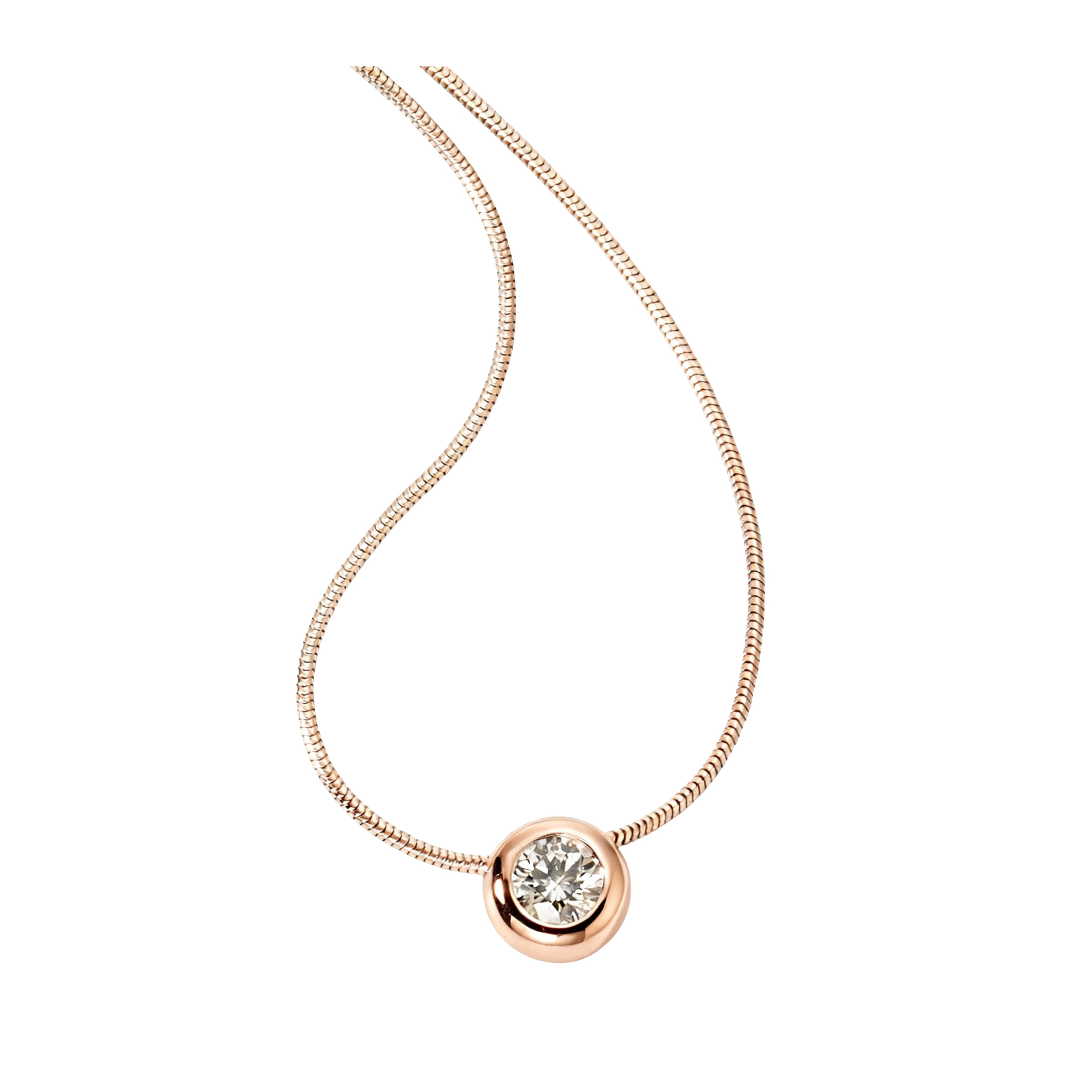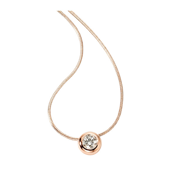 Der Anhänger ist aus 750er Rotgold (18 Karat) gefertigt und trägt einen funkelnden Brillanten, der in einer modernen Zargenfassung gefasst ist. Diese schützende, glatte Fassung lässt den Diamanten sicher ruhen und zugleich in seiner ganzen Strahlkraft erblühen. Die feine Schlangenkette unterstreicht das puristische Design und schmiegt sich elegant an die Haut an. Zusammen bilden Anhänger und Kette ein harmonisches Ganzes – dezent, edel und von natürlicher Ausstrahlung.