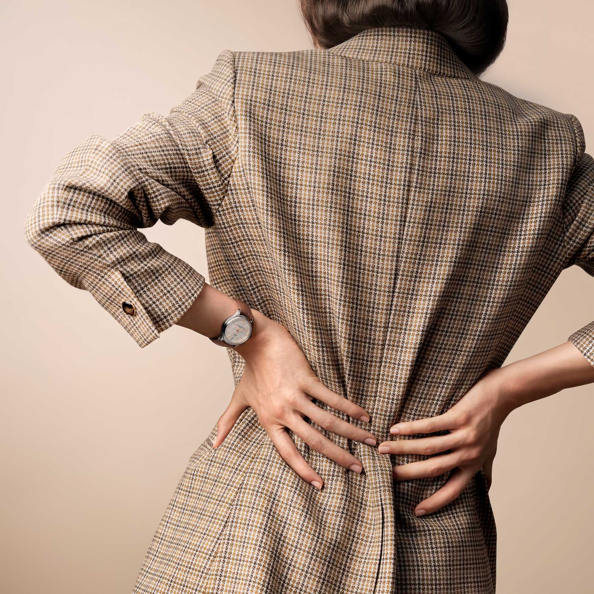 Cremefarbenes Zifferblatt mit arabischen Ziffern und Indizes