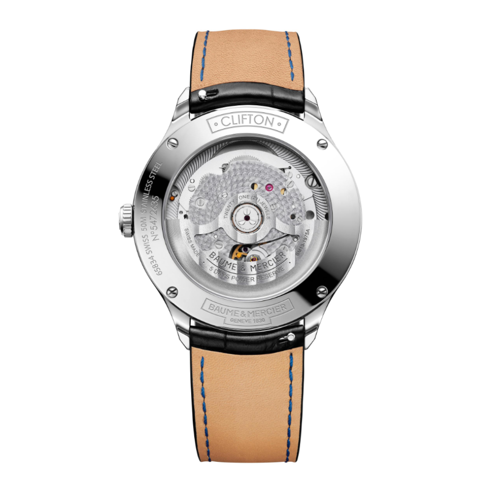 Die oszillierende Schwungmasse ist mit Genfer Streifen und spiralförmigen Verzierungen gestaltet,
