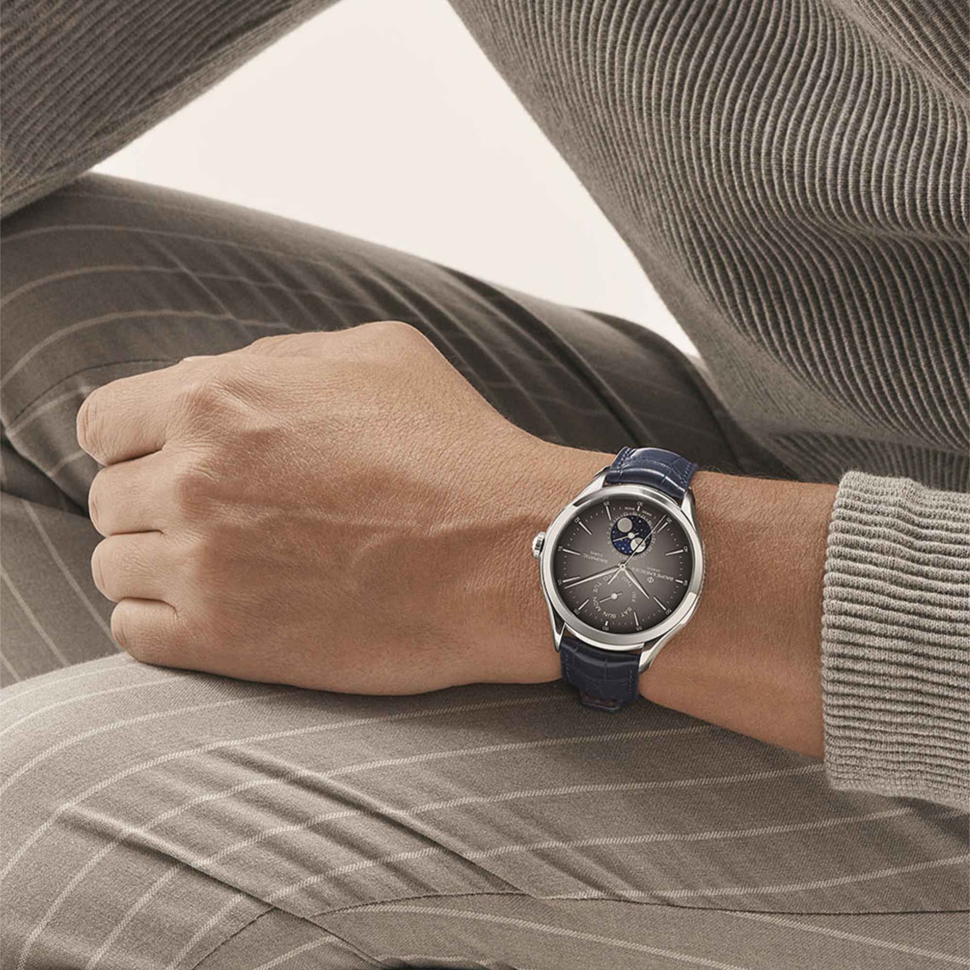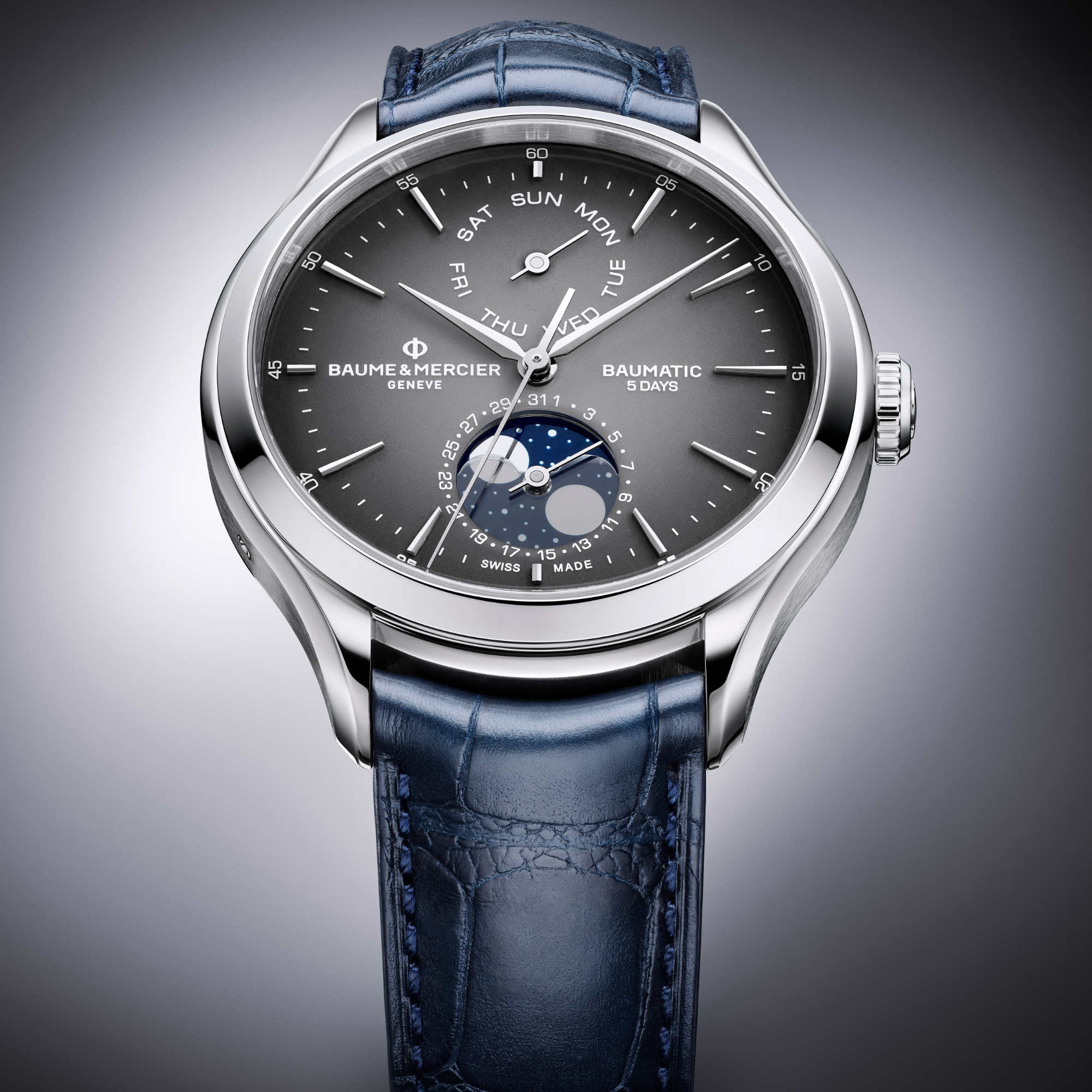 Polierte, rhodinierte Mondphasenscheibe mit blau lackiertem Finish