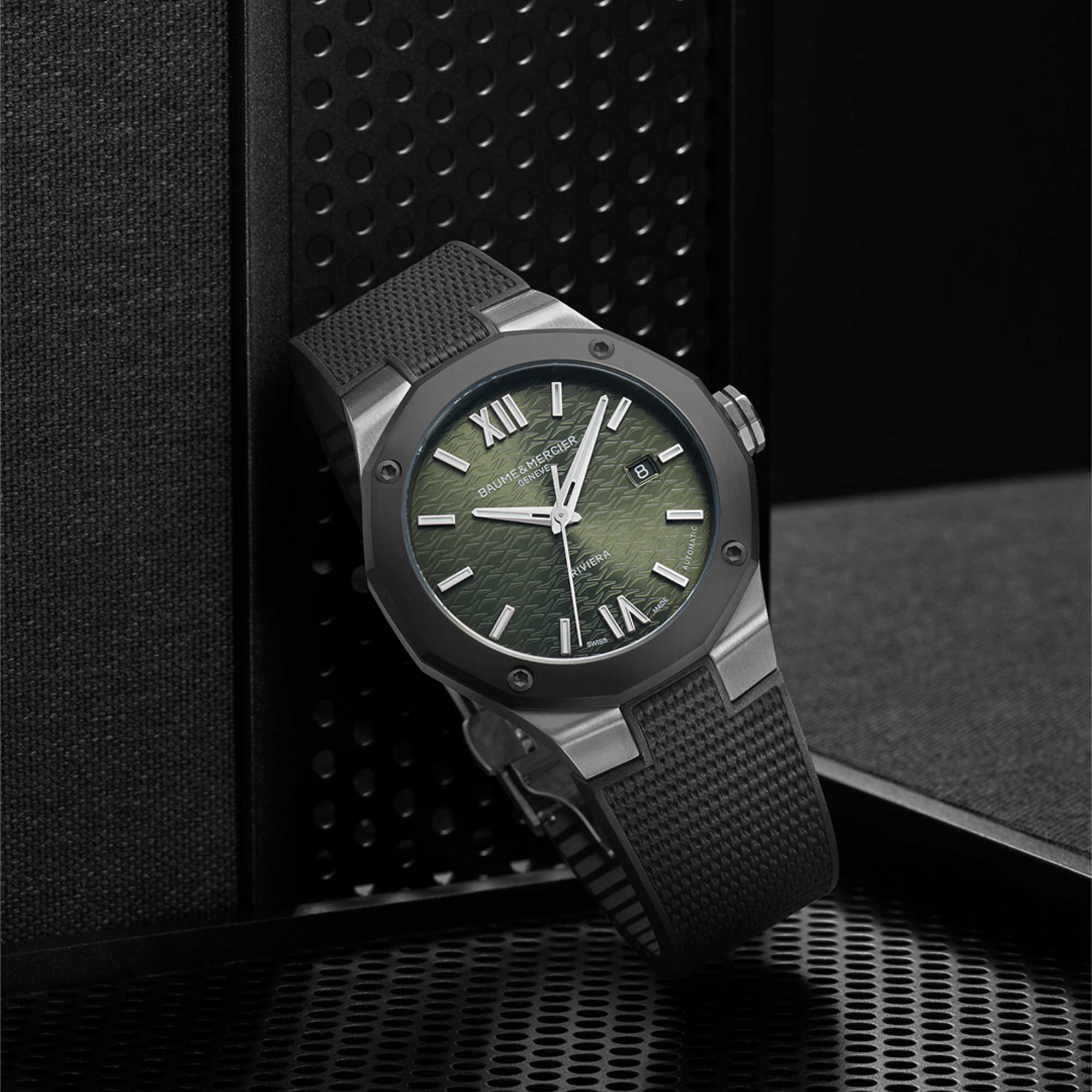 Ref. M0A10763 - Die mit einem „Swiss Made“-Automatikwerk ausgestattete Riviera 10763 führt ein 42-mm-Stahlgehäuse, eine Lünette aus sandgestrahltem, ADLC-beschichtetem Stahl, ein dunkelgrünes Zifferblatt und ein auswechselbares schwarzes Kautschukarmband zusammen. Die Kombination all dieser Designmerkmale verleiht diesem Zeitmesser Kühnheit. Er ist dadurch die perfekte Wahl für Menschen, die nach Vielseitigkeit und Charakter suchen.