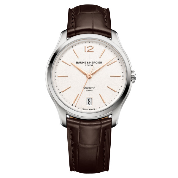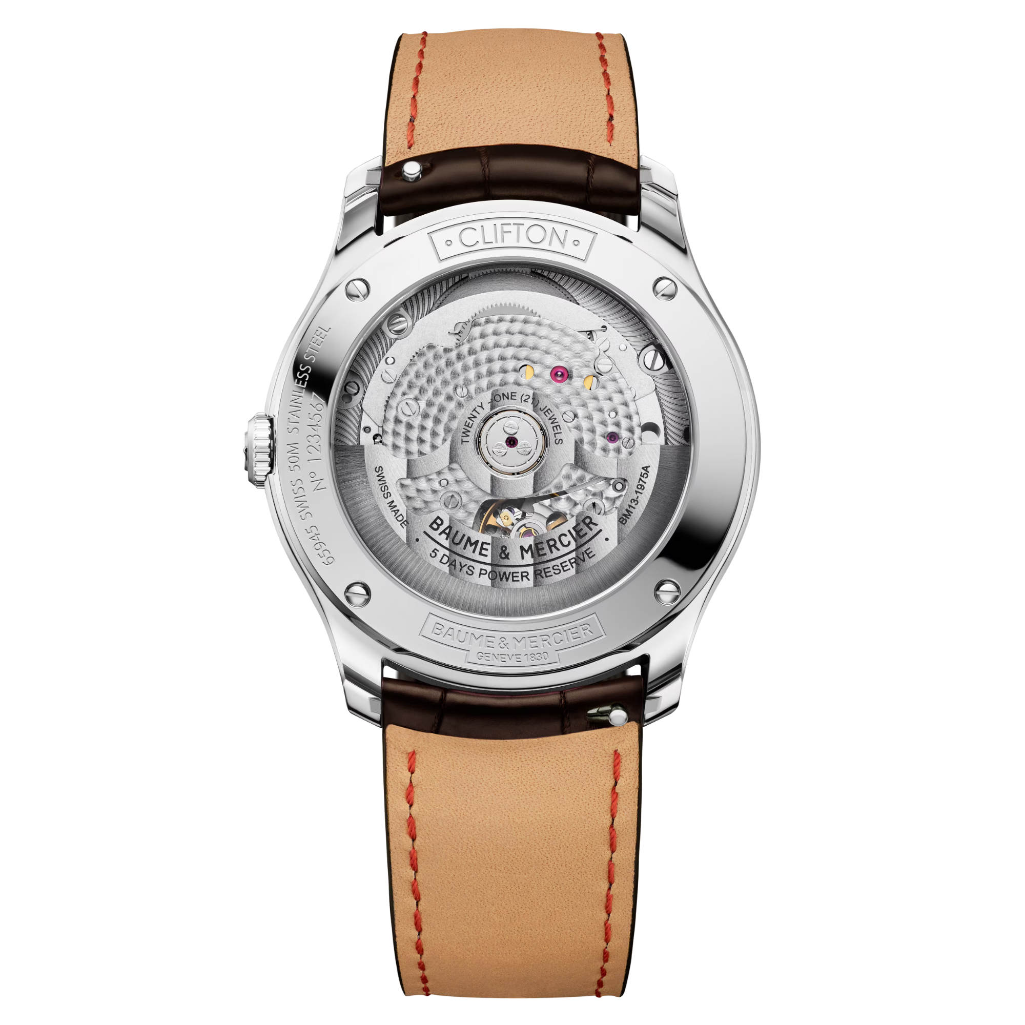 Ref. M0A10773 - Die Clifton 10773 verfügt über ein rundes Gehäuse aus poliert-satiniertem Stahl und ergänzt die Kollektion im Format 39 mm. Das Gehäuse ist mit einer Krone aus Edelstahl und einem offenen Saphirglasboden ausgestattet. Das dezente, cremefarbene Zifferblatt mit gekörntem Finish, umrandet von einer schwarzen Minuteneinteilung und einem schwarzen Fadenkreuz, hebt die arabische Ziffer bei 12 Uhr, die facettierten, vergoldeten, trapezförmigen Indizes und die Alpha-Zeiger hervor. Sie ist mit einem Automatikwerk Baumatic BM13-1975A mit einer Gangreserve von 5 Tagen und einer Wasserdichtigkeit bis 5 bar (ca. 50 m) ausgestattet. Das braune Alligatorlederarmband lässt sich dank eines innovativen Wechselsystems ohne Werkzeug austauschen.