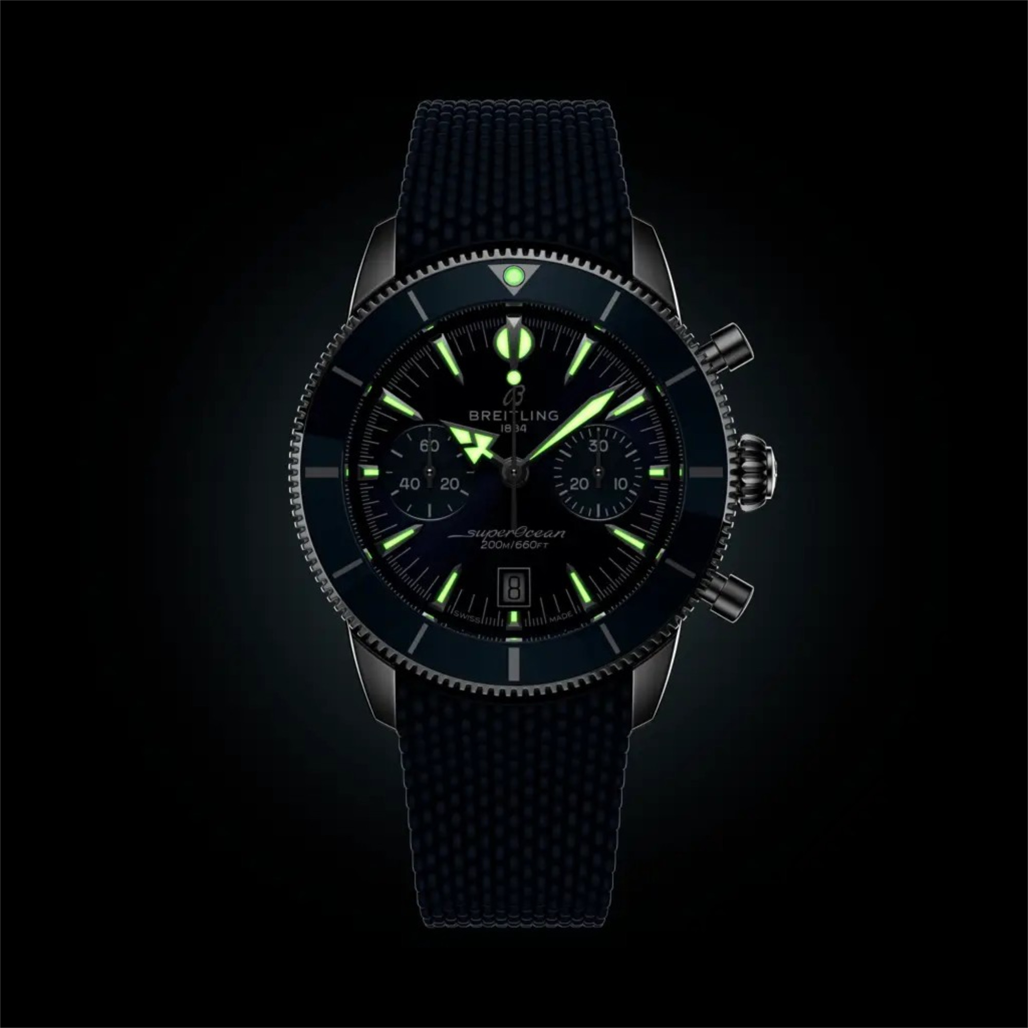 Auch heute noch ist diese Philosophie das Herzstück der Superocean Heritage. Die Seele der 50er Jahre, aber im neuen Kleid für die Gegenwart. Die neueste Superocean Heritage baut auf allem auf, was das Original unverwechselbar gemacht hat, und verfeinert es. Der Chronograph wird vom Breitling-Manufakturkaliber 01 angetrieben, dem branchenführenden Uhrwerk von Breitling. Eine Lünette mit Keramikeinlage bietet außergewöhnliche Kratzfestigkeit, während die integrierten Armbänder aus Mesh-Metall oder Mesh-Kautschuk eng am Gehäuse anliegen und mit Faltschließen für ein sauberes, wasserdichtes Finish gesichert werden. Ton-in-Ton-Hilfszifferblätter, ein diskretes Datumsfenster auf sechs Uhr und die originalen Signaturzeiger Pfeil für die Stunden, Speer für die Minuten – sorgen für Ablesbarkeit und Ausgewogenheit, über oder unter der Oberfläche.