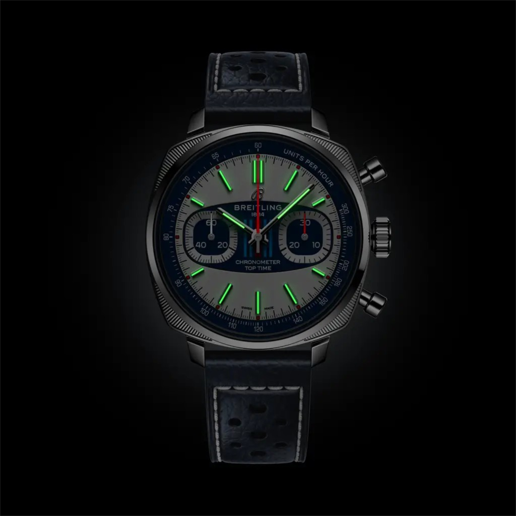 Sie hat eine schlanke Größe von 38 mm und ist mit einem perforierten, dunkelblauen Kalbslederarmband mit Faltschließe ausgestattet. Im Inneren der Uhr schlägt das Breitling-Flaggschiff, das Manufakturkaliber 01 – ein COSC-zertifizierter Chronometer mit einer Gangreserve von 70 Stunden, der für Präzision unter Druck sorgt. Die auf 750 Stück limitierte Top Time Martini Racing verbindet Retro-Ästhetik mit modernem Komfort.