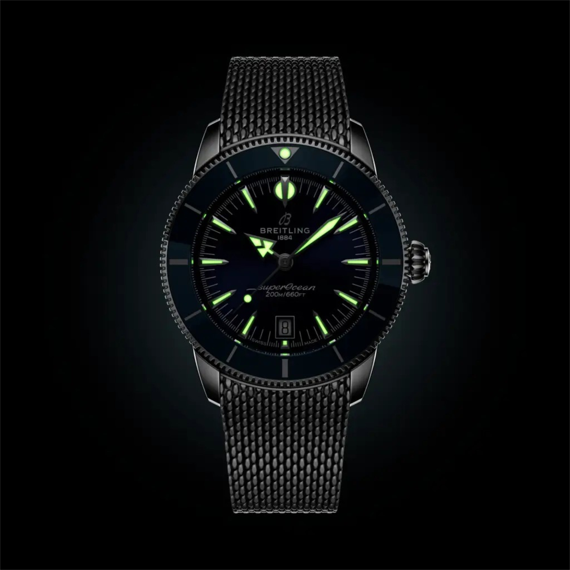 Auch heute noch ist diese Philosophie das Herzstück der Superocean Heritage. Die Seele der 50er Jahre, aber im neuen Kleid für die Gegenwart. Die neueste Superocean Heritage baut auf allem auf, was das Original unverwechselbar gemacht hat, und verfeinert es. Die Kollektion führt das Automatik-Uhrwerk B31 ein, Breitlings erstes exklusives Manufaktur-Kaliber mit drei Zeigern. Eine Lünette mit Keramikeinlage bietet außergewöhnliche Kratzfestigkeit, während die integrierten Armbänder aus Mesh-Metall oder Mesh-Kautschuk eng am Gehäuse anliegen und mit Faltschließen für ein sauberes, wasserdichtes Finish gesichert werden. Ein diskretes Datumsfenster auf sechs Uhr und die originalen Signaturzeiger– Pfeil für die Stunden, Speer für die Minuten – sorgen für Ablesbarkeit und Ausgewogenheit, über oder unter der Oberfläche.