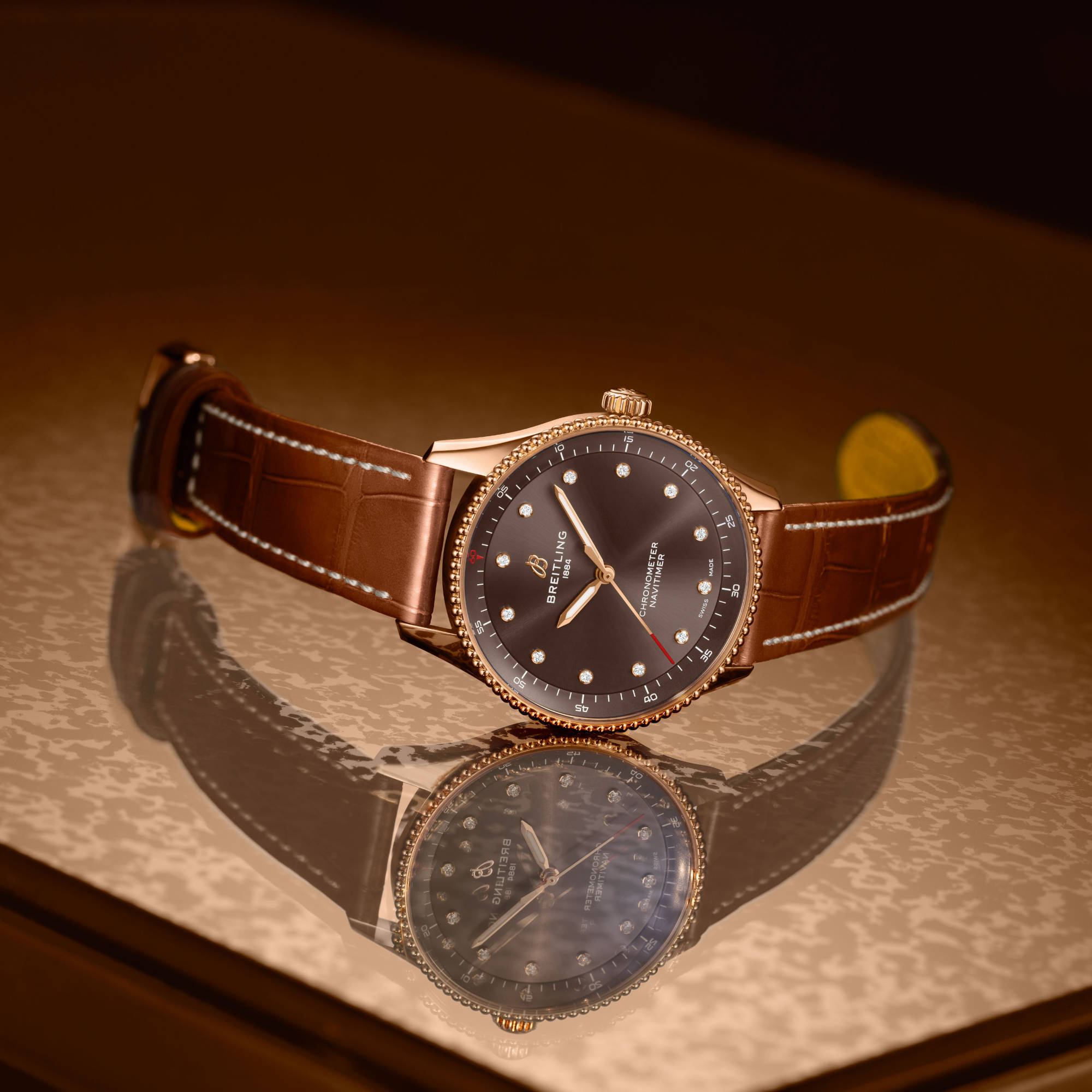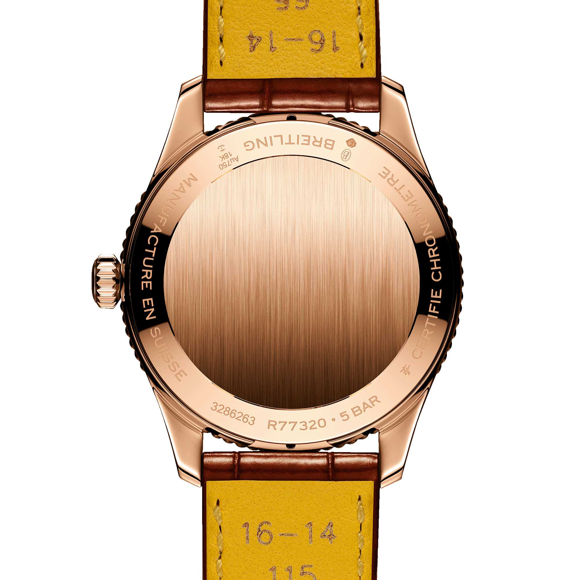 Ref. R77320E31Q1P1 - Breitlings Ikone – für die Reise. Die Navitimer ist eine der bekanntesten Uhren, die je hergestellt wurden. Sie steht als eine der grossartigsten Uhren aller Zeiten auf den Sammlerlisten. Was 1952 als Instrument für Piloten begann, hat inzwischen eine tiefe Bedeutung für jeden, den dieser Zeitmesser auf seiner persönlichen Reise begleitet. Unsere Ikone kommt jetzt in den Grössen 36 und 32 mm für Frauen und Männer, die die Optik und Haptik einer Uhr mit kleinerem Durchmesser lieben. Während die 36-mm-Navitimer die Perlenlünette und den ikonischen kreisförmigen Rechenschieber aufweist, die der Navitimer ihr unverkennbares Aussehen verleihen, verzichtet die beeindruckende 32-mm-Variante auf den Rechenschieber zugunsten eines schlichteren Zifferblattdesigns, das auf den schlanken Durchmesser abgestimmt ist. Doch diese Blickfänger haben so viel mehr zu bieten als nur ihre schlanke neue Grösse. Pastelltöne, Perlmutt und rückverfolgbare Rohstoffe verbinden sich mit dezenten Feinheiten, um den Zeitmessern einen schmuckähnlichen Charakter zu verleihen – zusätzliche vielseitige Eleganz für die legendäre Navigationsuhr, die bereit für all Ihre Reisen ist.