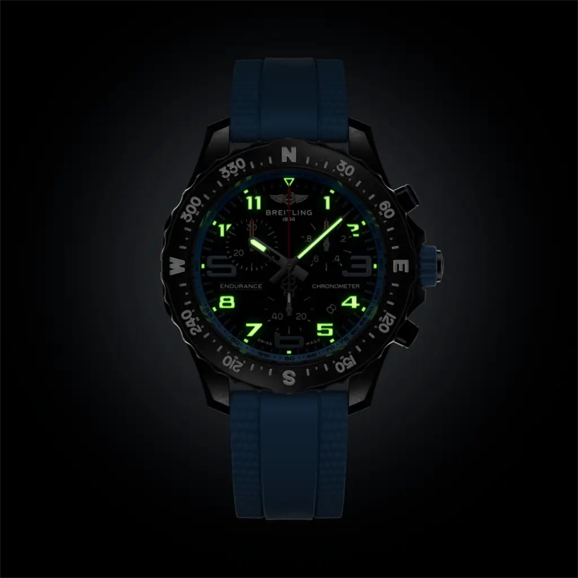 Die Endurance Pro verfügt über ein ultraleichtes Gehäuse aus Breitlight®. Dieser widerstandsfähige Werkstoff ist 3,3-mal leichter als Titan und 5,8-mal leichter als Edelstahl. Das antimagnetische, thermisch stabile und hypoallergene Breitlight® ist hochgradig kratz-, zug- und korrosionsfest. Die haptische Wirkung ist wärmer als die von Metall; der leichte Textureffekt unterstreicht den Einfallsreichtum des Designs. Das Material ist zu 100 % Swiss-made und nur bei Breitling erhältlich. Neben einem Durchmesser von 44 mm oder 38 mm haben Athleten bei der Endurance Pro ausserdem die Wahl zwischen zahlreichen farbenfrohen Zifferblättern und Kautschukarmbändern mit der Breitlight®-Dornschliesse. Beide Grössen werden vom Breitling-Kaliber 82 bzw. 83 angetrieben. Diese COSC-zertifizierten SuperQuartz™-Chronographen zeichnen sich durch eine aussergewöhnliche Ganggenauigkeit aus.