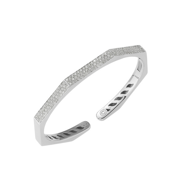 Dieser elegante Armreif aus der Brave-Kollektion von Crivelli vereint moderne Formensprache mit luxuriöser Diamantenpracht und verkörpert italienische Goldschmiedekunst auf höchstem Niveau. Gefertigt aus edlem 750 Weißgold, besticht das markant facettierte Design durch klare Linien und eine architektonische Ästhetik, die dem Schmuckstück seine charakteristische Ausdruckskraft verleiht. Insgesamt 135 brillantgeschliffene Diamanten mit einem Gesamtgewicht von 1,52 Karat sorgen für ein intensives, fein funkelndes Lichtspiel, das sich elegant über die Oberfläche des Armreifs legt und ihn zu einem strahlenden Blickfang macht. Das kühle Schimmern des Weißgoldes verstärkt die Brillanz der Diamanten und unterstreicht die moderne, luxuriöse Wirkung des Designs.
