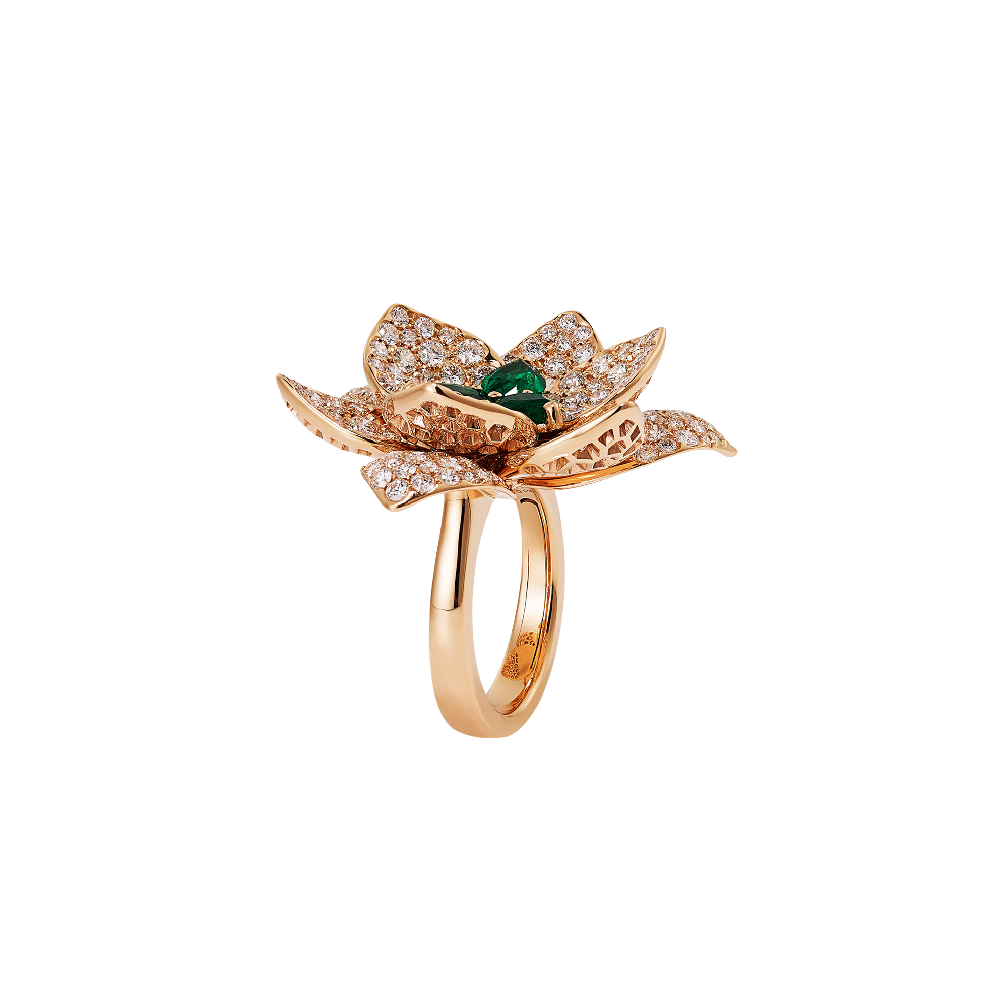 Im Zentrum des Designs setzen drei leuchtende Smaragde im Tropfenschliff mit insgesamt 1,78 Karat einen edlen, farblichen Akzent. Ihr sattes Grün bildet einen faszinierenden Kontrast zum warmen Roségold und zum strahlenden Diamantbesatz und verleiht dem Ring eine ausdrucksstarke, luxuriöse Note. Die harmonische Verbindung aus kostbaren Materialien, funkelnden Diamanten und intensiver Edelsteinfarbe macht dieses Schmuckstück zu einem unverwechselbaren Blickfang mit hohem Wiedererkennungswert.