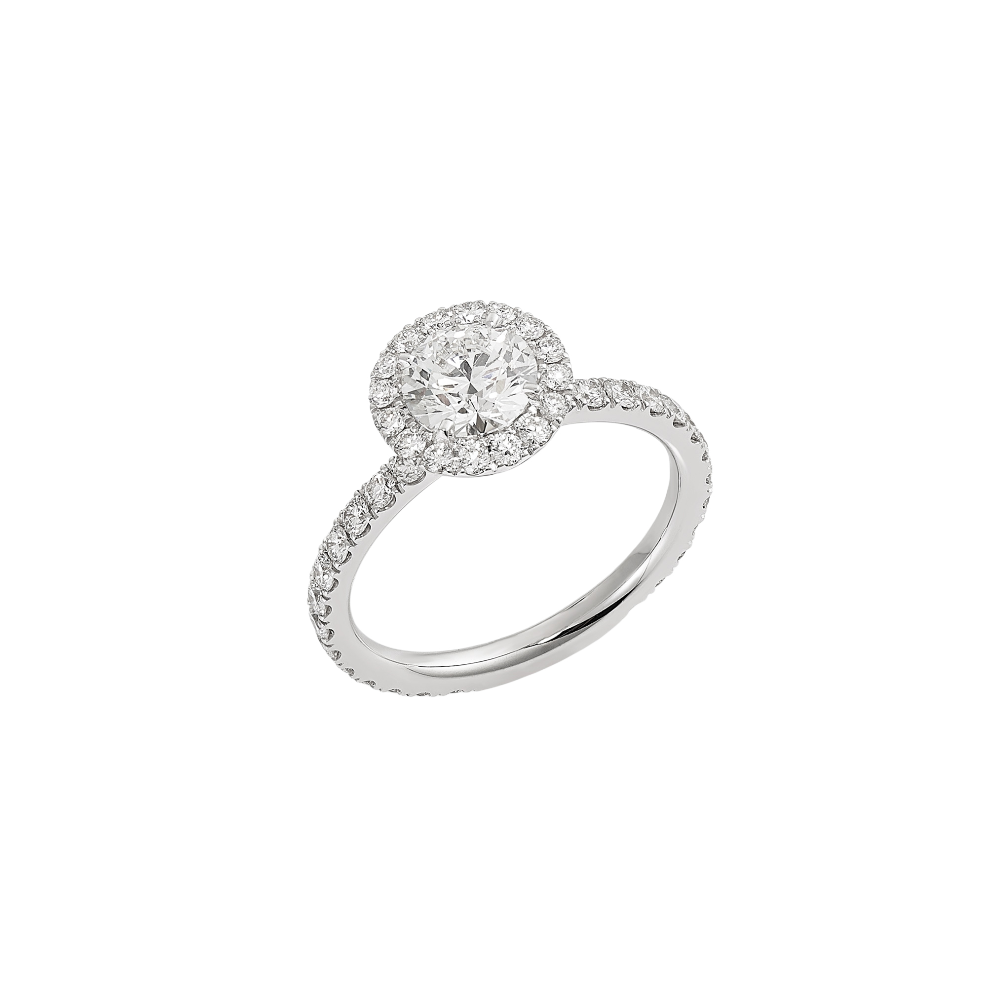 Im Mittelpunkt steht ein feinweißer Diamant im Brillantschliff mit 1,0 Karat, der mit seiner außergewöhnlichen Leuchtkraft und seinem intensiven Feuer sofort alle Blicke auf sich zieht. Der perfekt proportionierte Brillantschliff sorgt für maximale Lichtreflexion und verleiht dem Ring eine souveräne, elegante Präsenz. Umrahmt wird der Mittelstein von einer funkelnden Halo-Fassung, die seine Brillanz zusätzlich verstärkt.
