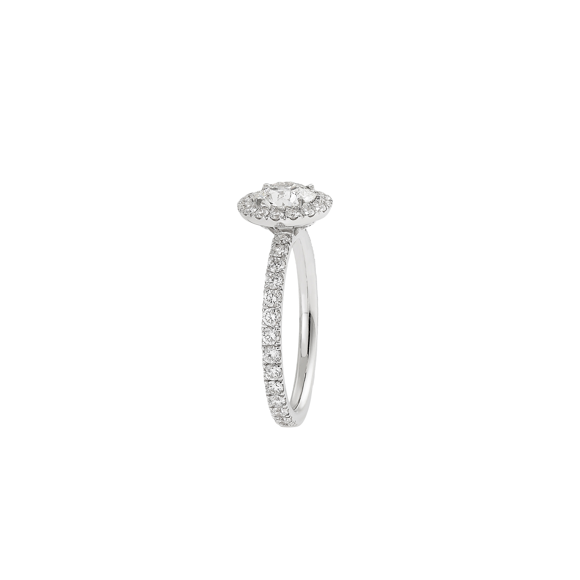 Die filigrane Ringschiene ist mit 48 feinweißen Diamanten im Brillantschliff mit einem Gesamtgewicht von 0,9 Karat besetzt. Diese verleihen dem Ring eine eindrucksvolle Tiefe und ein luxuriöses Funkeln, das sich bei jeder Bewegung entfaltet und den edlen Charakter des Designs unterstreicht.