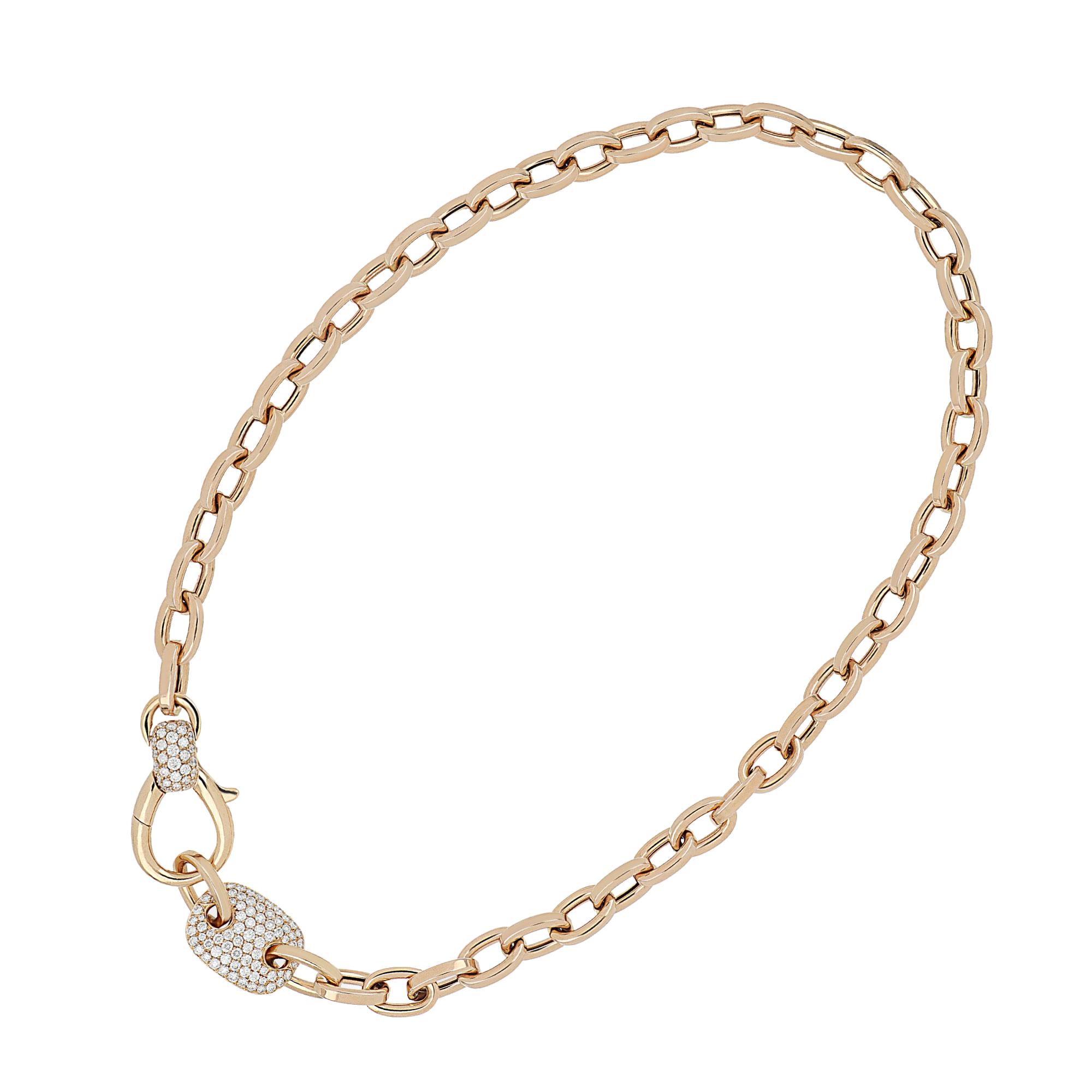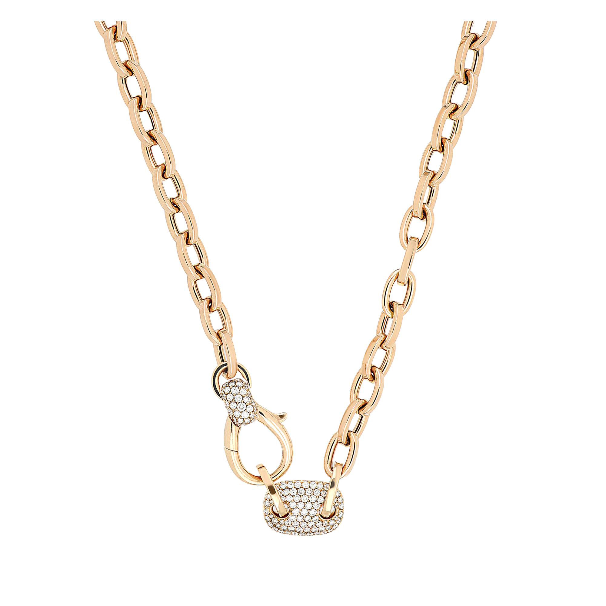 Gefertigt aus hochwertigem 750 Roségold, überzeugt die Halskette durch ihren warmen Glanz und ihre klare Linienführung. Mehrere ausgewählte Elemente sind mit 227 brillant geschliffenen Diamanten besetzt, die mit einem Gesamtgewicht von 4,2 Karat für intensive Leuchtkraft und exklusive Eleganz sorgen. Die diamantbesetzten Details setzen funkelnde Akzente und unterstreichen den luxuriösen Charakter der Kette, ohne ihre zeitlose Wirkung zu verlieren.
