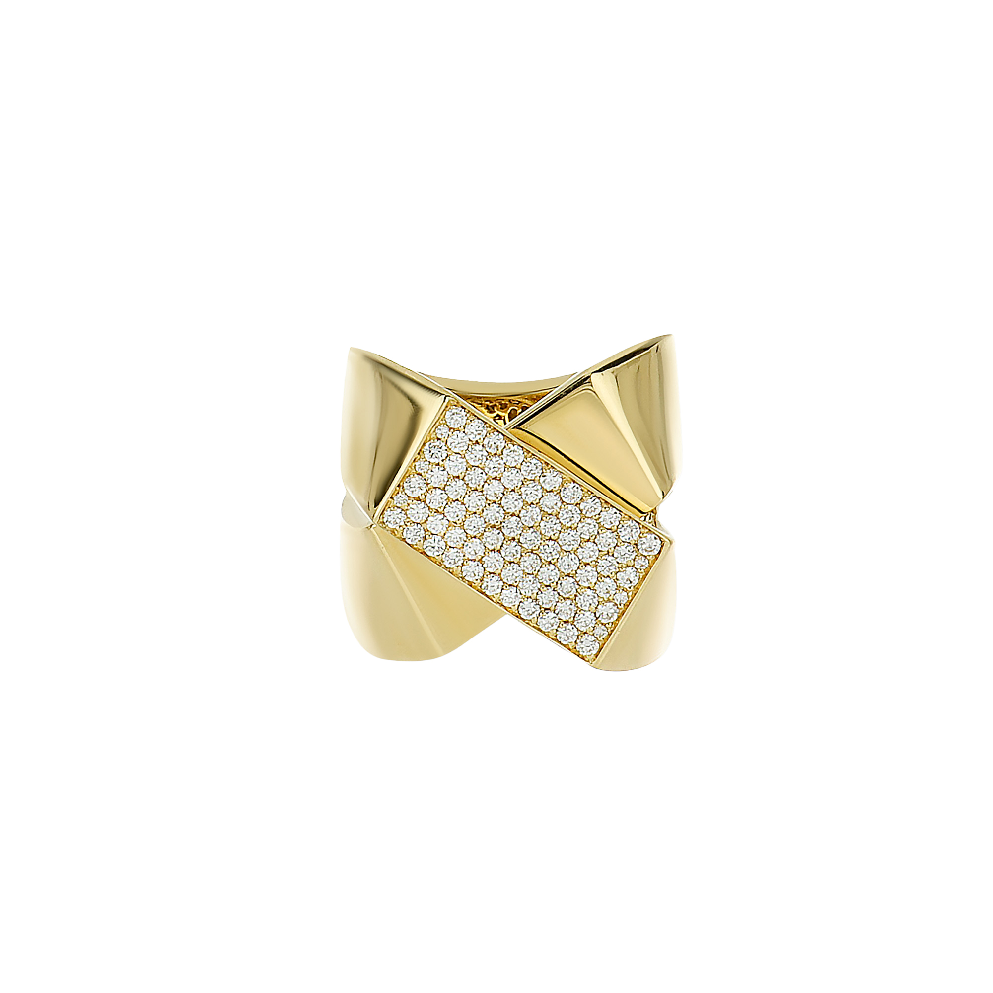Das zentrale rechteckige Element ist vollständig mit 80 funkelnden Diamanten im Pavébesatz ausgefasst. Mit einem Gesamtgewicht von 0,72 Karat sorgen die edlen Steine für ein beeindruckendes Lichtspiel, das den warmen Glanz des Gelbgoldes eindrucksvoll unterstreicht. Die raffinierte Architektur des Rings macht ihn zu einem Blickfang, der Modernität und zeitlose Eleganz harmonisch vereint.