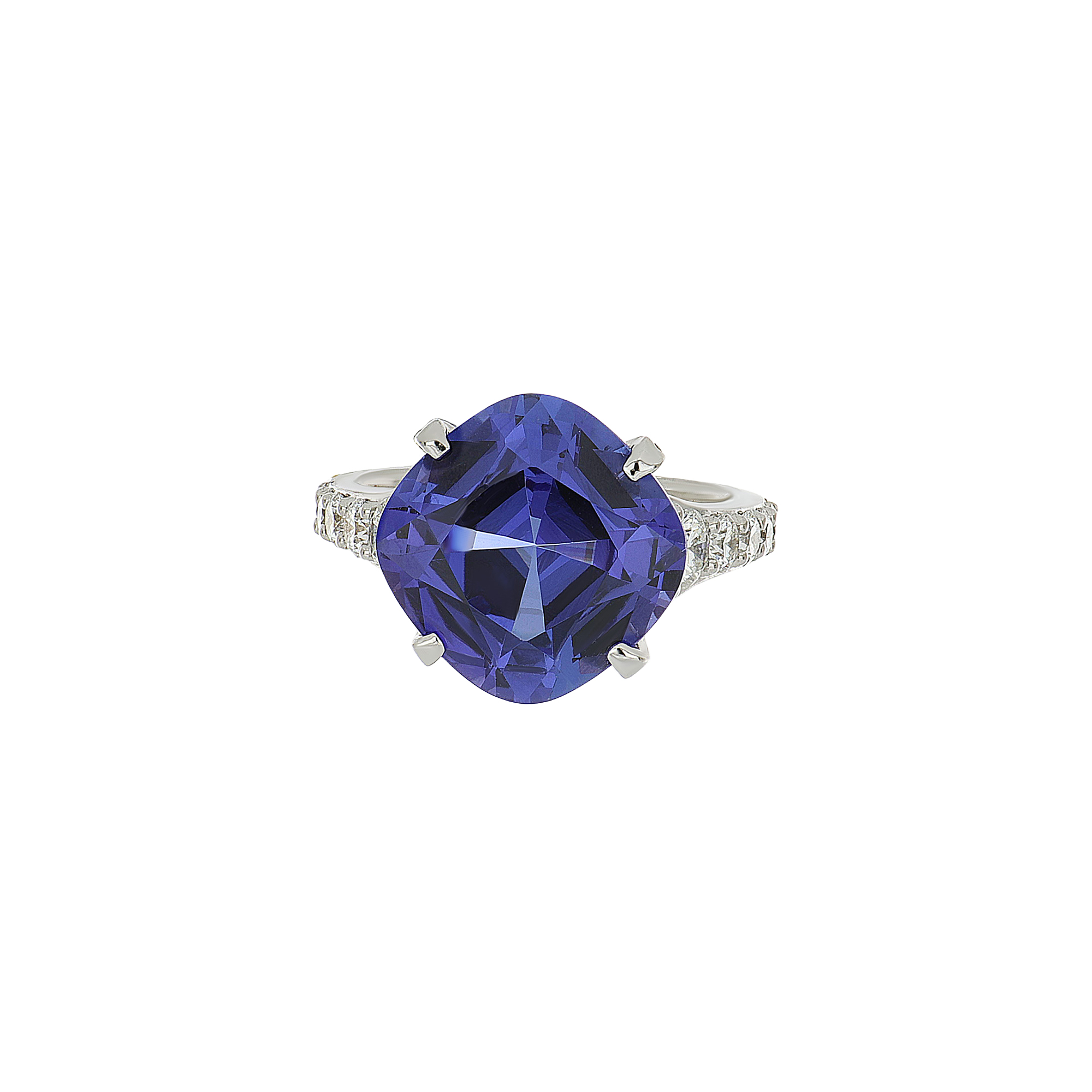 Flankiert wird der kostbare Farbstein von 40 feinweißen Diamanten im klassischen Brillantschliff mit einem Gesamtgewicht von 1,36 Karat. Die funkelnden Diamanten setzen den Tansanit wirkungsvoll in Szene und unterstreichen seine außergewöhnliche Präsenz mit strahlender Brillanz. Die harmonische Verbindung aus dem weich gerundeten Kissenschliff, der klaren Linienführung des Weißgoldes und dem lebhaften Diamantfeuer verleiht dem Ring eine zeitlose, zugleich moderne Ausstrahlung.