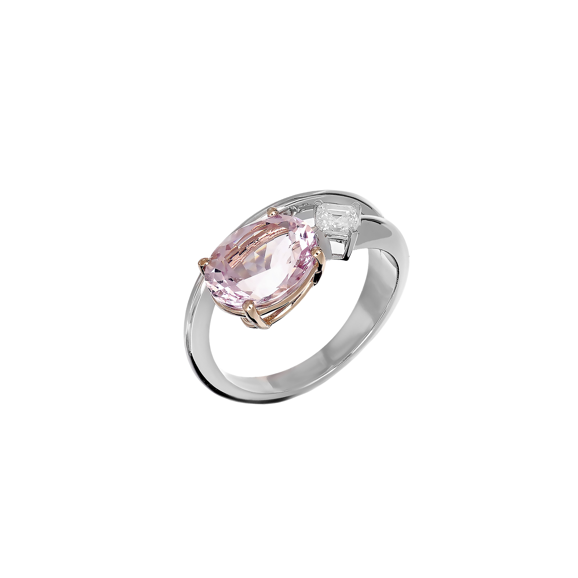 Ergänzt wird das Design durch einen feinweißen Diamanten im eleganten Asscherschliff mit insgesamt 0,22 Karat, der mit seiner klaren, geometrischen Form für einen spannenden, modernen Gegenpol sorgt. Das Zusammenspiel aus oval geschliffenem Morganit, strengem Asscherschliff und der harmonischen Kombination von Weiß- und Roségold verleiht dem Ring eine besondere Tiefe und Individualität. Der Ring schmiegt sich angenehm an den Finger und ist sowohl im Alltag als auch zu besonderen Anlässen ein stilvoller Begleiter.