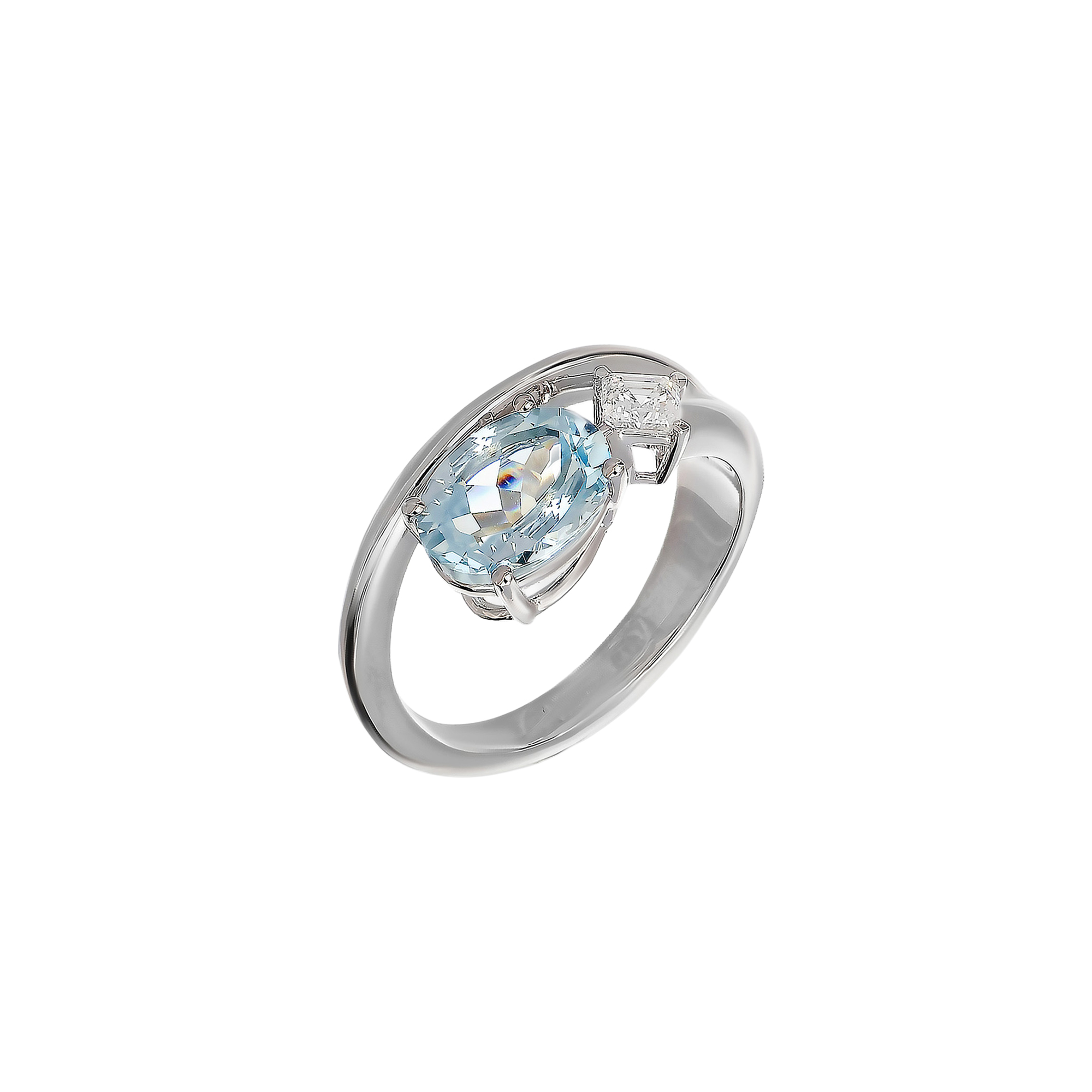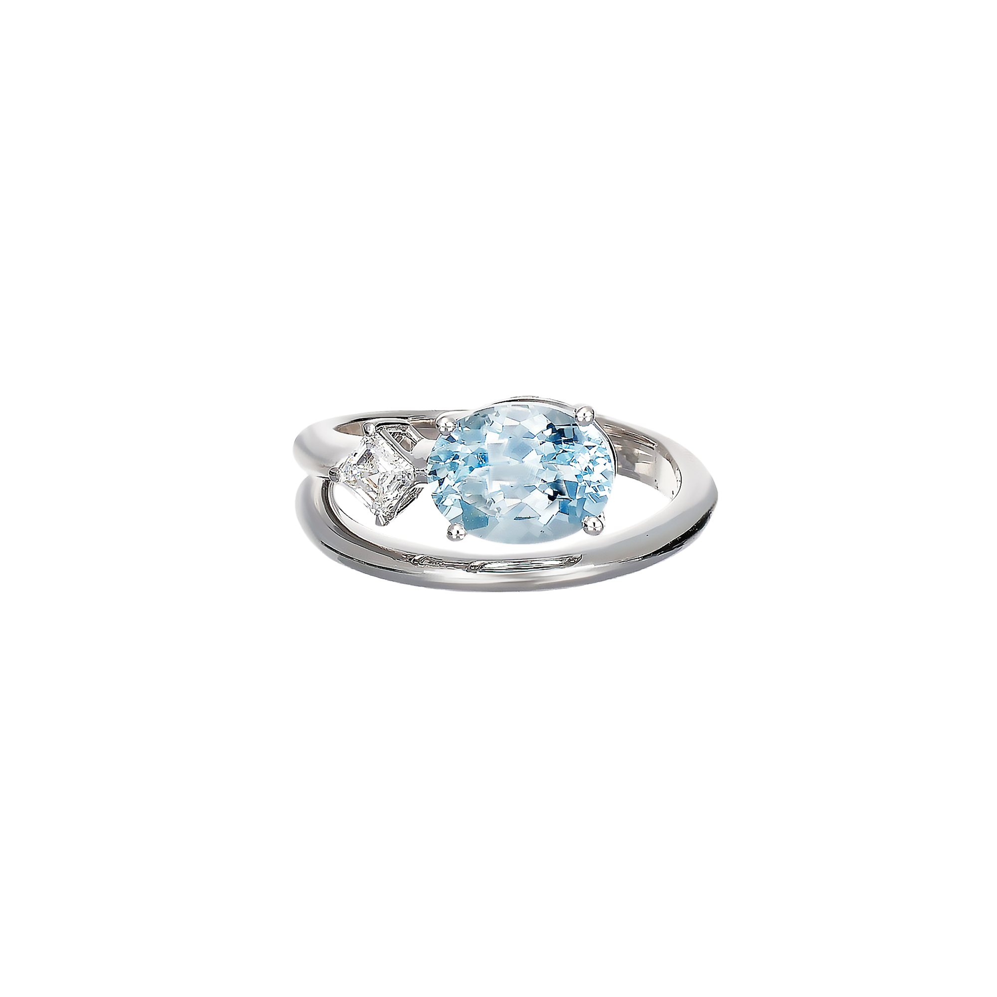 Akzentuiert wird der Mittelstein durch einen feinweißen Diamanten im eleganten Asscherschliff mit insgesamt 0,21 Karat. Mit seiner klaren, geometrischen Linienführung setzt der Diamant einen modernen Kontrast zur weichen Form des Aquamarins und verleiht dem Ring zusätzliche Raffinesse und architektonische Klarheit. Das Zusammenspiel aus dem kühlen Glanz des Weißgoldes, dem sanften Blau des Aquamarins und der präzisen Brillanz des Diamanten macht diesen Ring zu einem außergewöhnlich stilvollen Schmuckstück mit individueller Note.