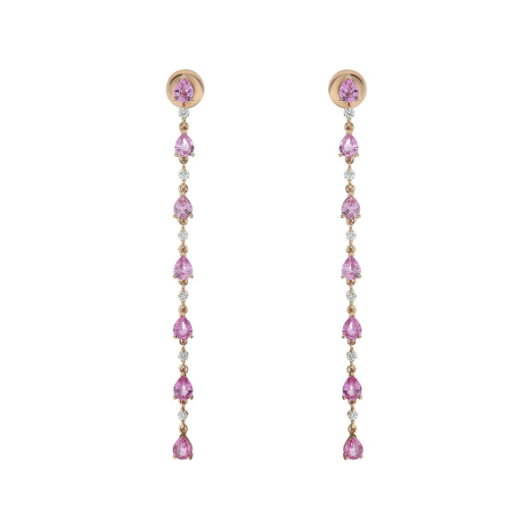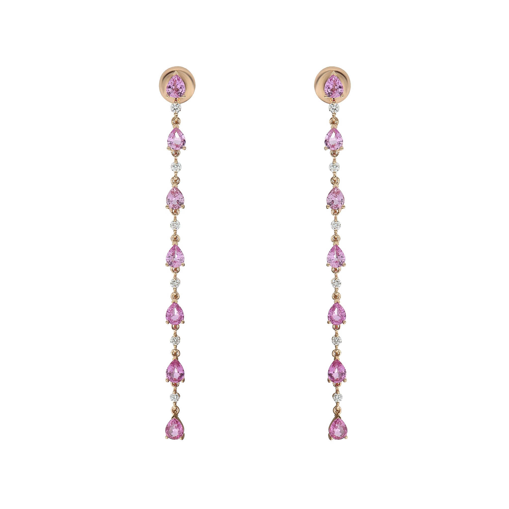 Im Mittelpunkt stehen 14 rosafarbene Saphire im Tropfenschliff mit einem Gesamtgewicht von 5,08 Karat, die in sanften Rosétönen schimmern und dem Schmuckstück eine besondere Ausdruckskraft verleihen. Zwischen den Saphiren setzen 12 feinweiße Diamanten mit insgesamt 0,48 Karat funkelnde Akzente und sorgen für eine brillante Lichtreflexion. Das Zusammenspiel aus farbigen Edelsteinen und Diamanten verleiht den Ohrhängern Tiefe, Raffinesse und eine luxuriöse Ausstrahlung.
