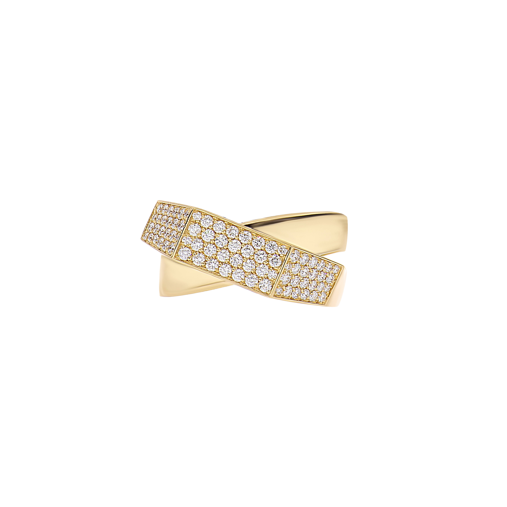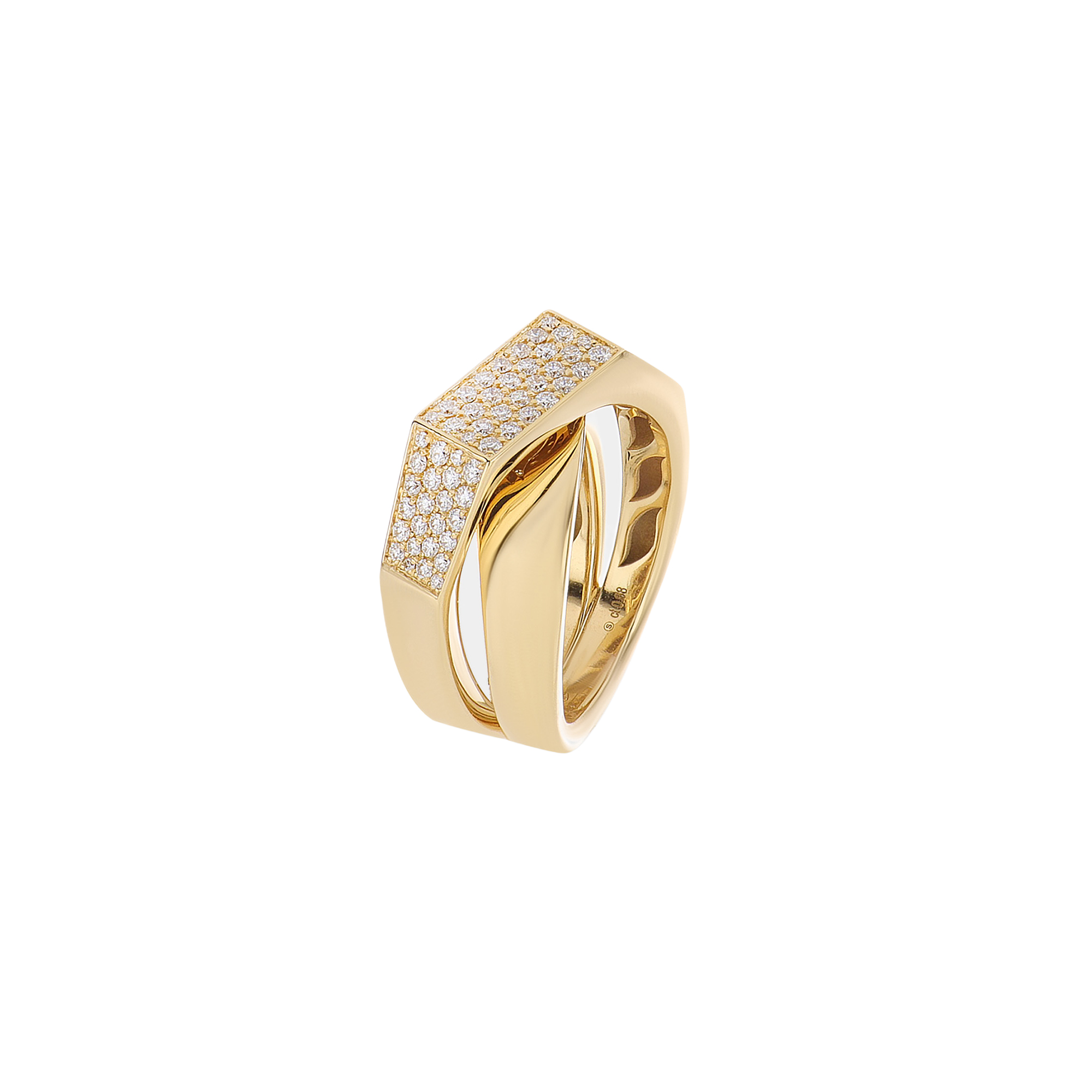 Das zentrale geometrische Element ist vollständig mit 78 funkelnden Diamanten pavégefasst. Ihr intensives Strahlen bildet einen spektakulären Kontrast zum warmen Glanz des Gelbgoldes und verleiht dem Ring eine außergewöhnliche Präsenz. Dieses Design steht für Mut, Eleganz und moderne Ausdrucksstärke – die Kernwerte der Brave Kollektion von Crivelli.