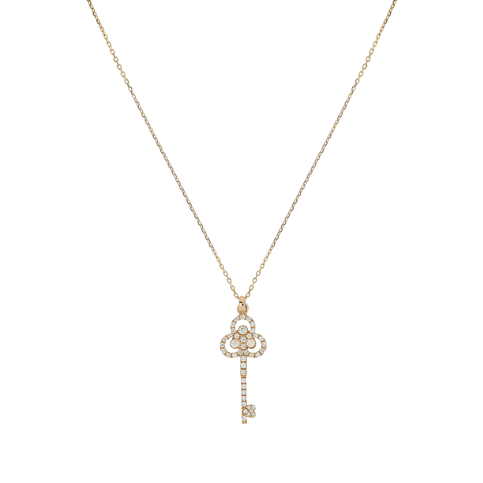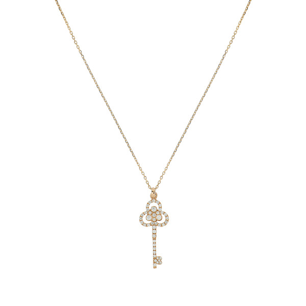 Der Schlüssel ist mit 43 feinweißen Diamanten mit einem Gesamtgewicht von 0,4 Karat besetzt und entfaltet ein dezentes, zugleich lebendiges Funkeln. Die präzise gefassten Diamanten unterstreichen die filigranen Konturen des Motivs und setzen strahlende Akzente, die das warme Roségold stilvoll ergänzen. Durch die ausgewogene Kombination aus Symbolik und feiner Brillanz wirkt die Halskette sowohl modern als auch zeitlos.