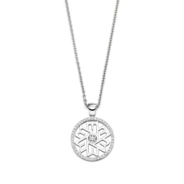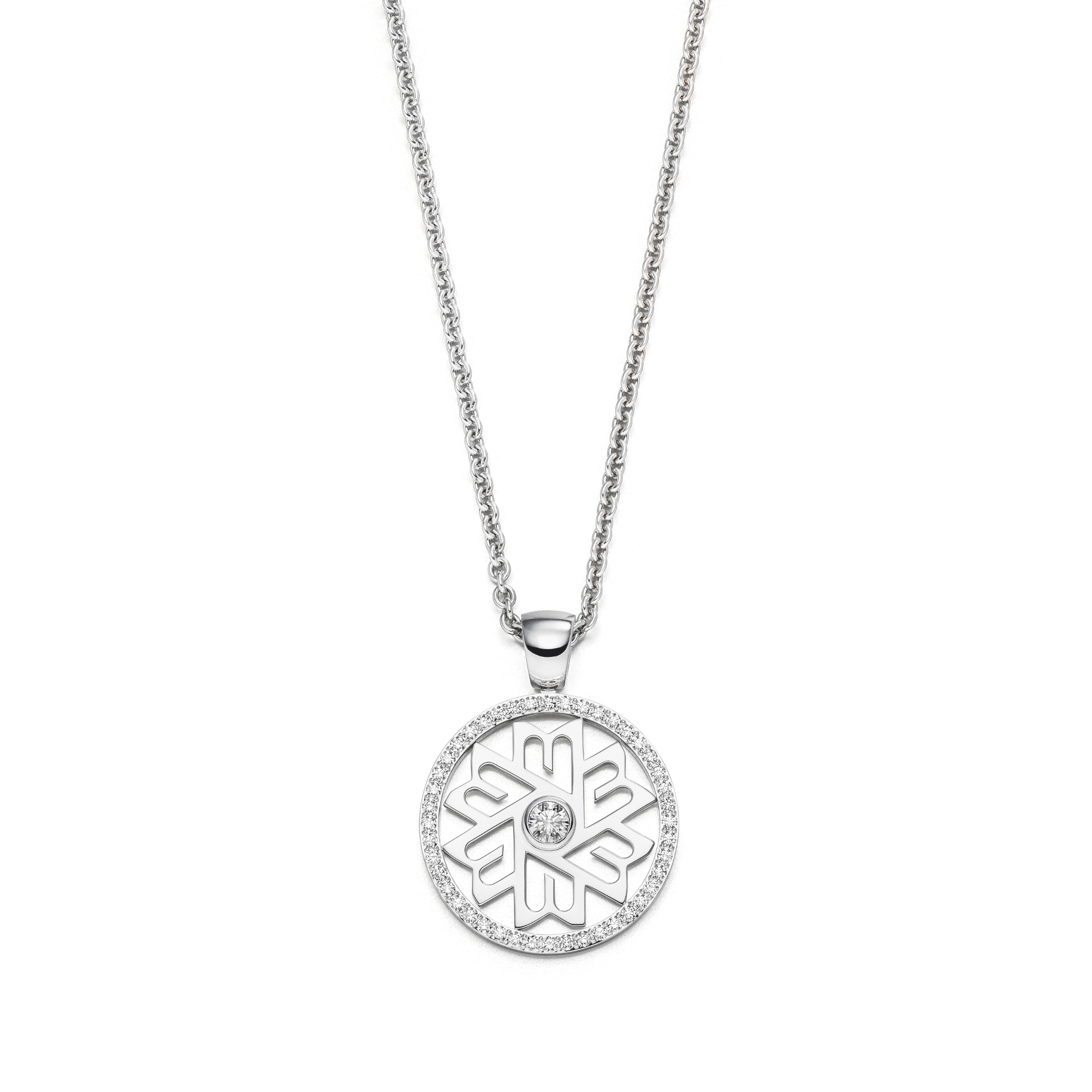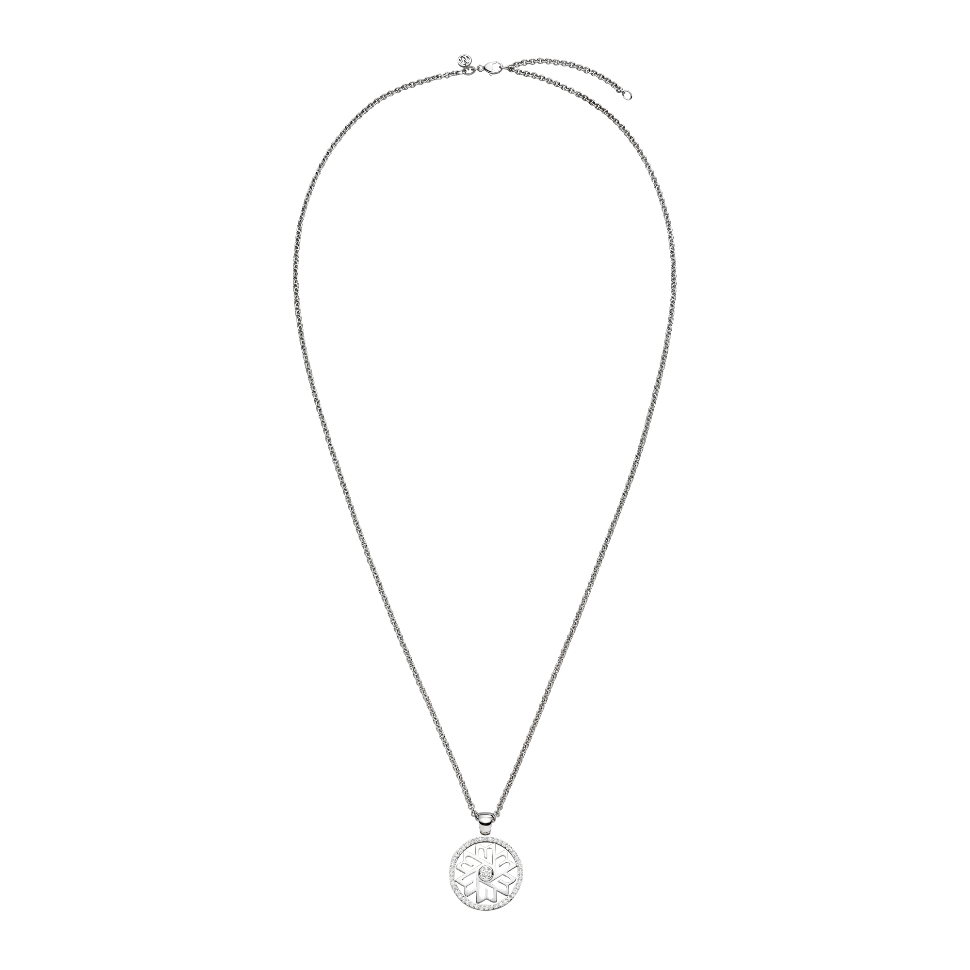 Im Zentrum des Designs steht das stilisierte Mühlenrad – ein Markenzeichen der Kollektion – das mit seiner Form nicht nur die Kraft des Wassers und der Bewegung zitiert, sondern auch eine subtile Referenz an den Buchstaben M wie Mühlbacher in seinen Speichen trägt. Eingefasst in feinstem 750er Weißgold, ist der Anhänger mit insgesamt 45 funkelnden Diamanten besetzt, die ein Gesamtgewicht von 0,87 Karat aufweisen und das Spiel von Licht und Bewegung mit jeder Bewegung elegant einfangen.