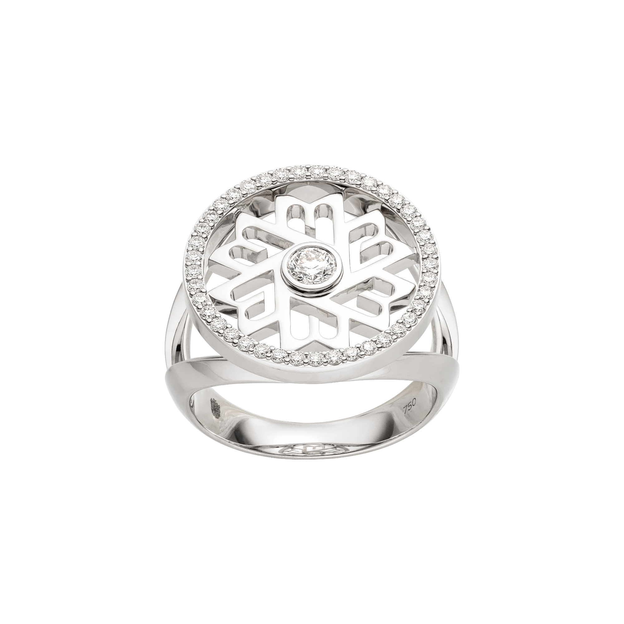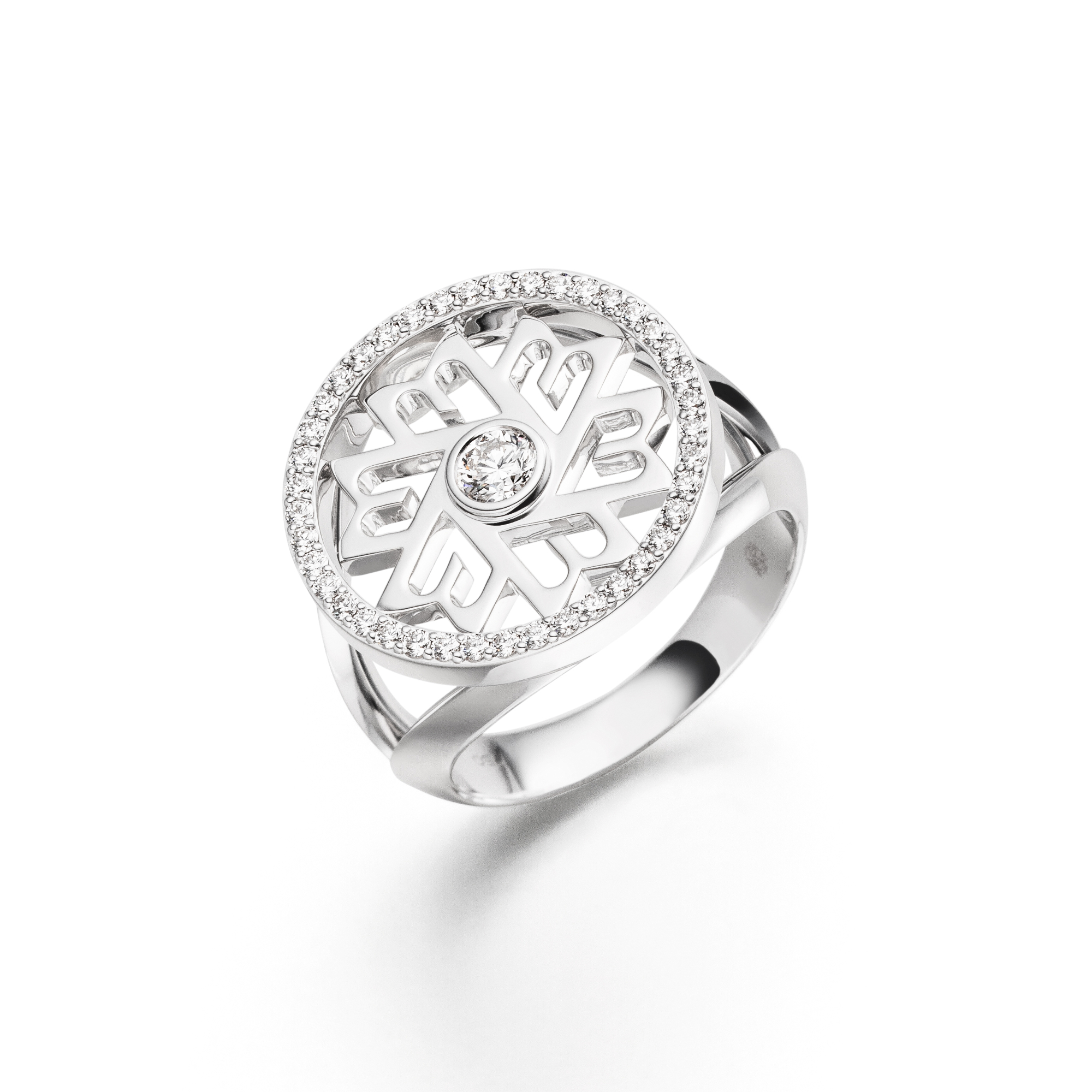 Ein einzelner Brillant bildet das Herzstück des Designs, eingefasst von einem feinen Pavé-Kreis aus 41 Diamanten, die den Ring in ein festliches Licht tauchen. Die breite, sanft geschwungene Ringschiene sorgt für einen sicheren Sitz und unterstreicht die architektonische Qualität des Entwurfs.