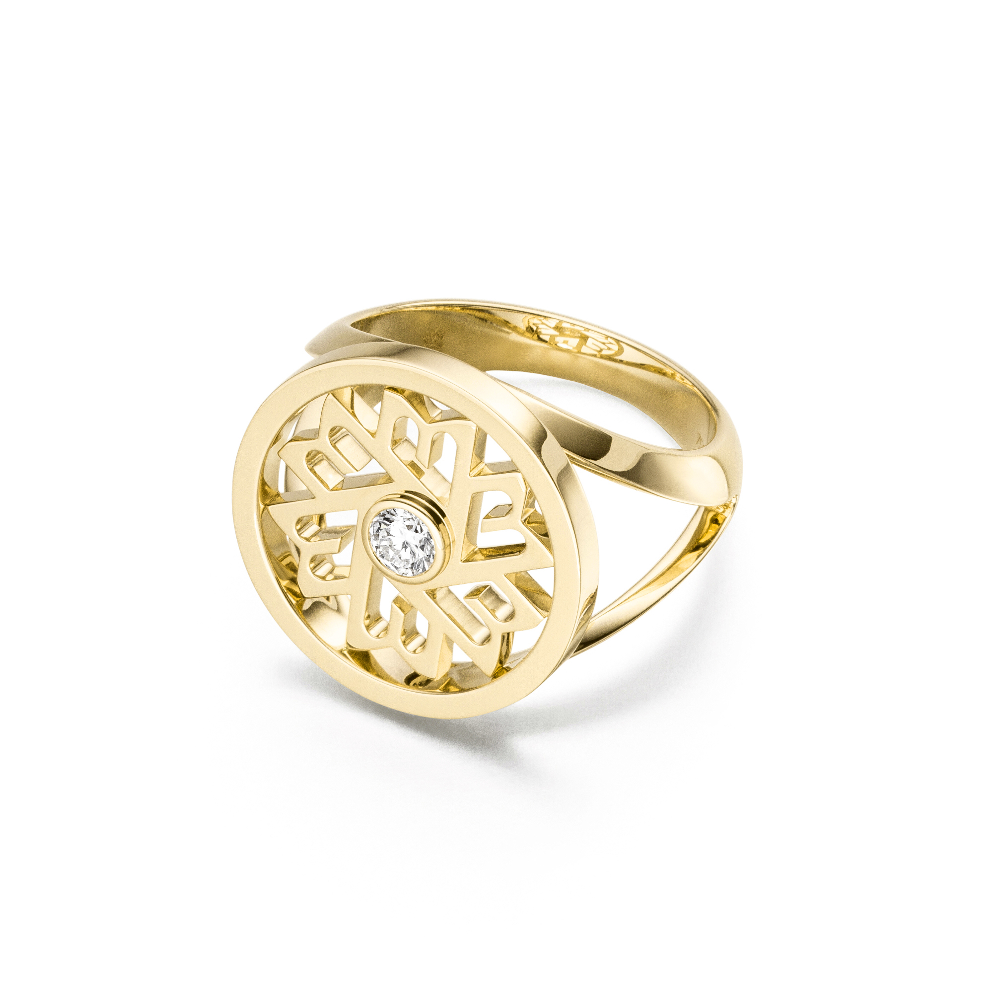Der Ring aus der Mill River Collection von Danuvina by Mühlbacher vereint präzise Handwerkskunst mit sinnlicher Symbolik. Gefertigt im traditionsreichen Mühlbacher Atelier in Regensburg, erzählt er eine Geschichte, die von den Mühlenrädern der Donau inspiriert ist – kraftvoll, rhythmisch und zeitlos. Das Design greift das Motiv eines stilisierten Mühlenrads auf, in dem sich die Anfangsbuchstaben des Namens Mühlbacher kunstvoll zu einem ornamentalen Zentrum verweben.