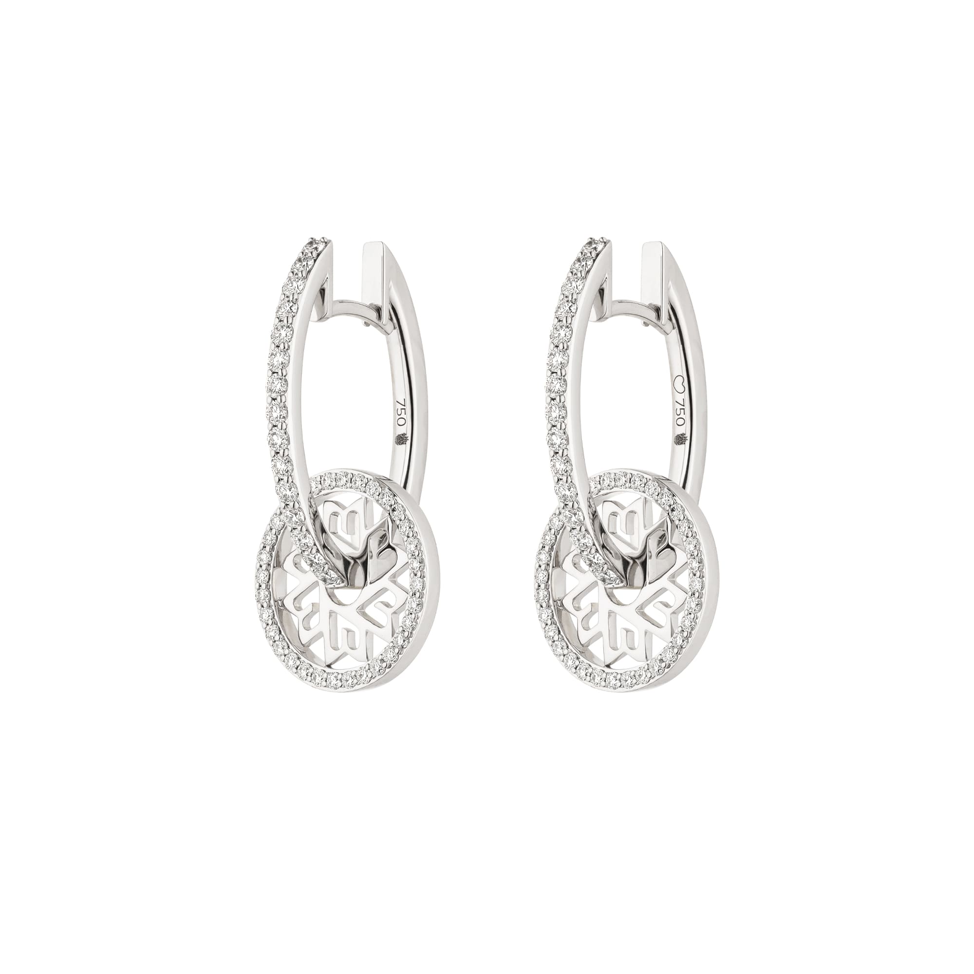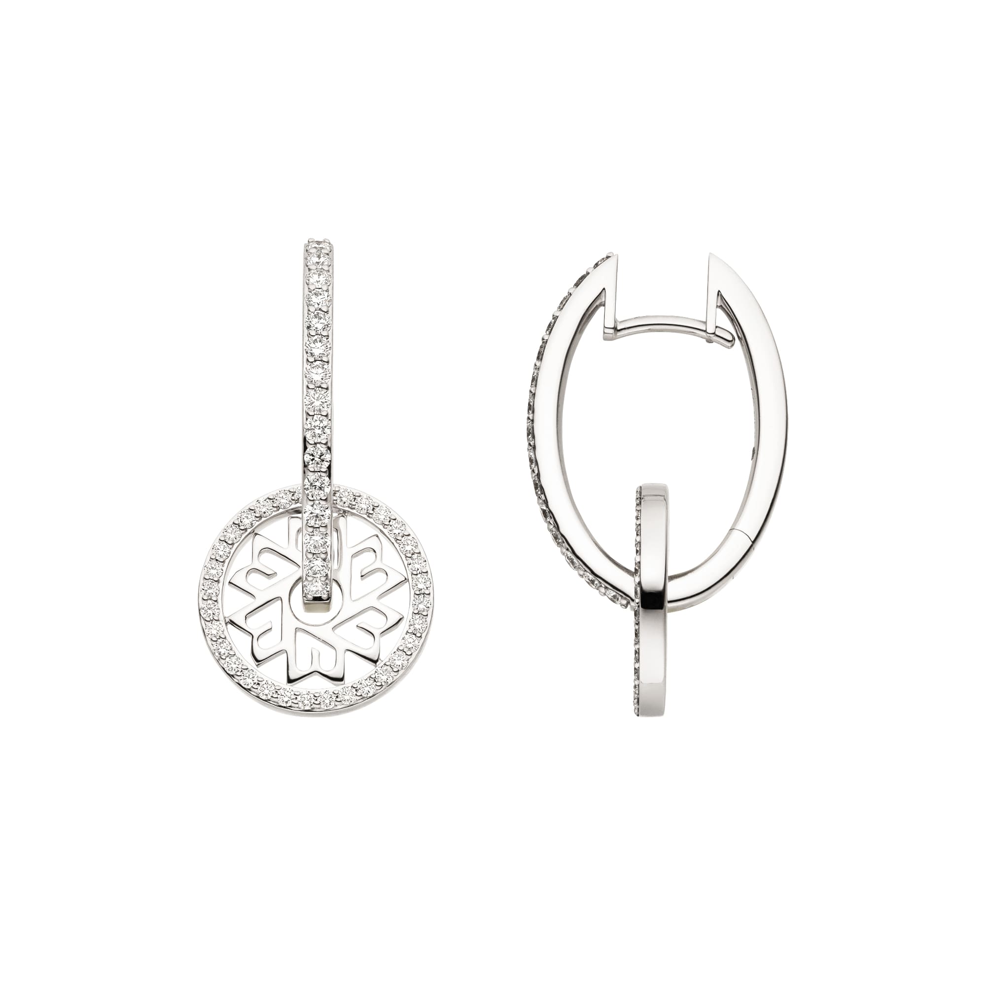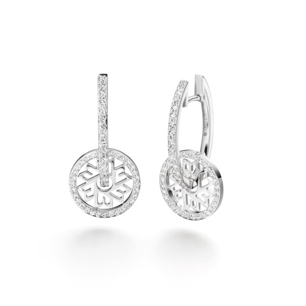 Gefertigt aus edlem 750er Weißgold, sind die Creolen mit 94 sorgfältig gefassten Diamanten veredelt, die mit einem Gesamtgewicht von 0,73 Karat ihre funkelnde Wirkung entfalten. Die Diamanten umrahmen das Radmotiv und setzen auch entlang der elegant geschwungenen Stege brillante Akzente.