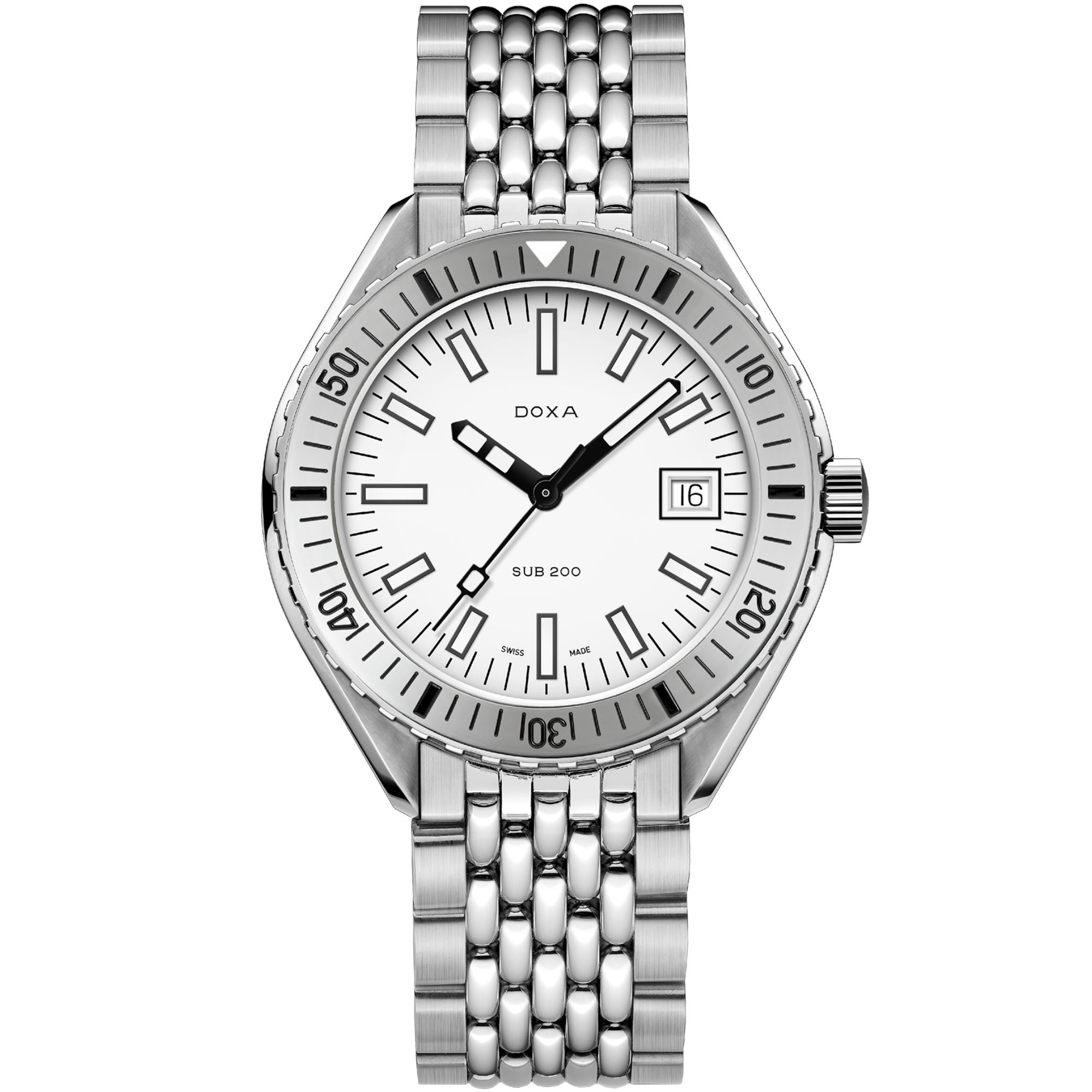 Ref. 796.10.011.10 - Diese auf der Baselworld 2019 eingeführten 3-Zeiger-Taucheruhr hat ein Gehäuse aus hochwertigem 316L-Edelstahl mit einem Durchmesser von 42 mm. Das kratzfeste, entspiegelte Saphirglas der SUB 200 besticht durch die markante Wölbung des damals verwendeten Plexiglas. Das Modell ist bis zu einer Tiefe von 200 Metern (20 bar) wasserdicht und verfügt über eine einseitig drehbare Lünette. Sämtliche Elemente, die Tauchinformationen liefern, ausser der Lünette, sind mit einer Super-LumiNova®-Leuchtbeschichtung versehen. Das Armband aus 316-L-Edelstahl weist auf der Faltschliesse das DOXA-Fischsymbol auf.