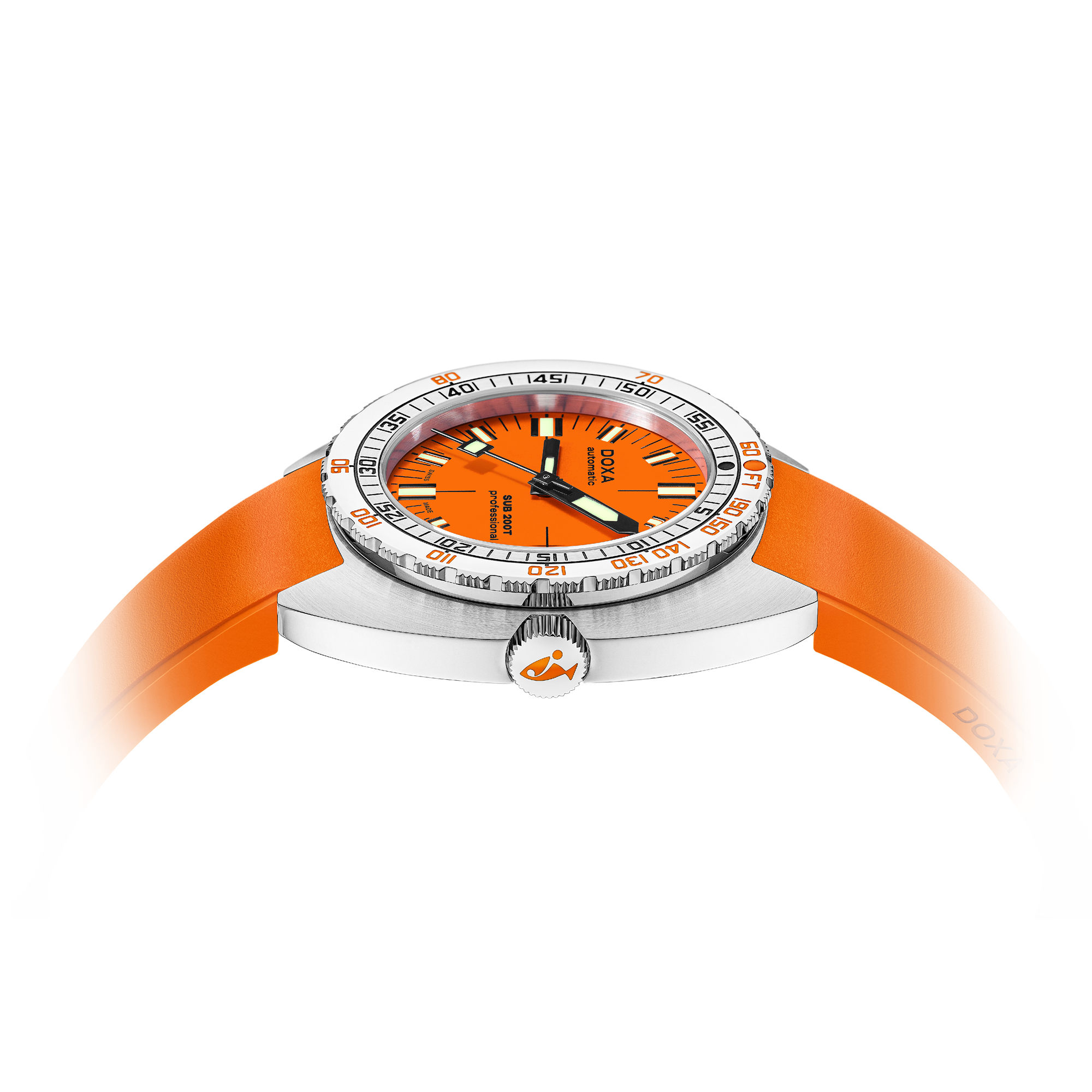 Ref. 804.10.351.21 - Die neue SUB 200T wirkt mit ihrem kleinen Durchmesser stilistisch moderner und raffinierter, übernimmt aber geschickt die DNA des Originals. Durch die Überarbeitung der Volumina innerhalb des Gehäuses wurde die Reduzierung auf einen eleganten 39-mm-Durchmesser sowie eine angenehmere Höhe von 10,70 mm möglich. Darüber hinaus hat DOXA das Zifferblattdesign optimiert, um eine zeitgemäßere Optik am Handgelenk zu erzielen.