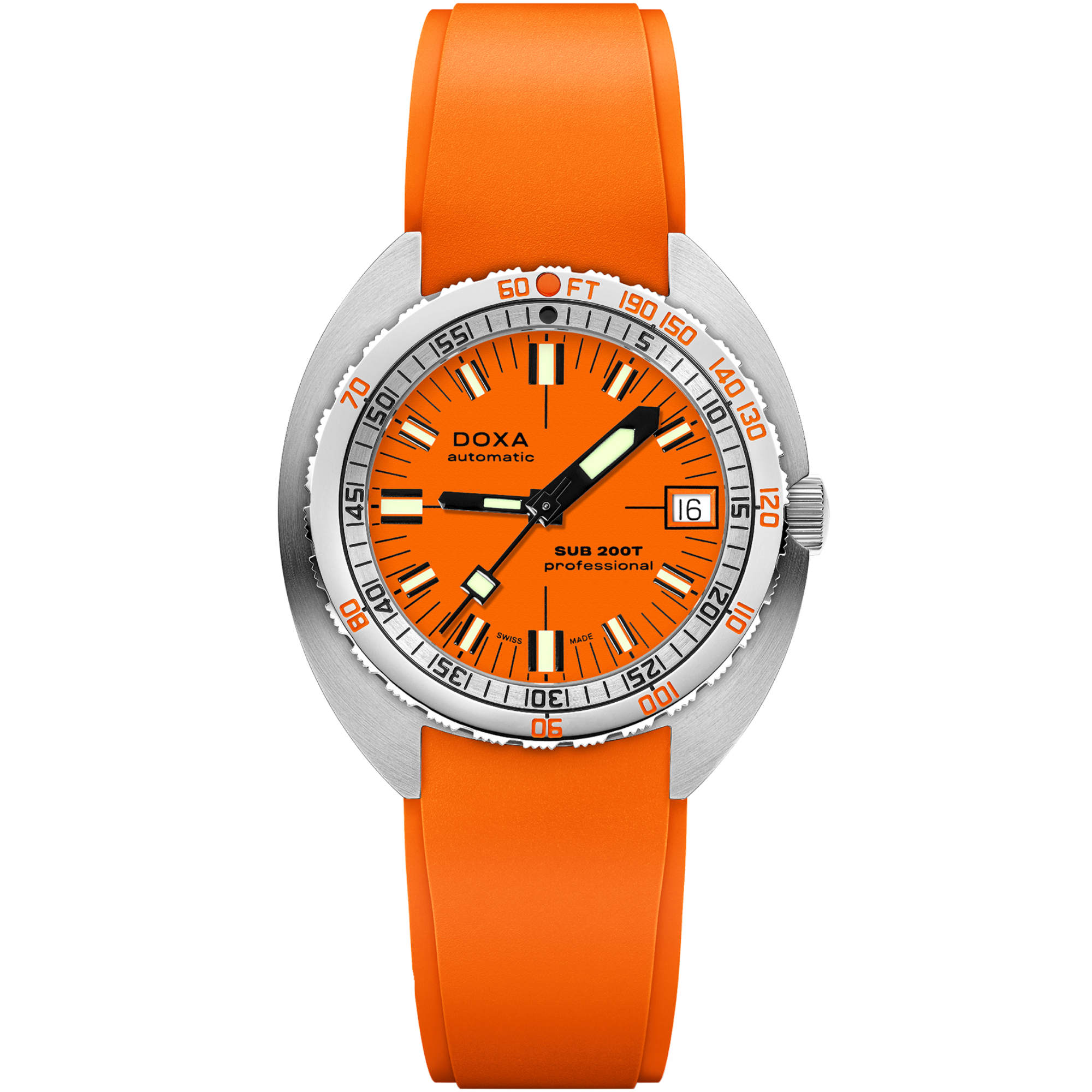 Die aus hochwertigem 316L-Edelstahl gefertigte SUB 200T ist eine 3-Zeiger-Taucheruhr mit der berühmten, patentierten, einseitig drehbaren Lünette von DOXA mit integrierter Nullzeittabelle der US Navy, dem Maßstab für Tauchsicherheit.