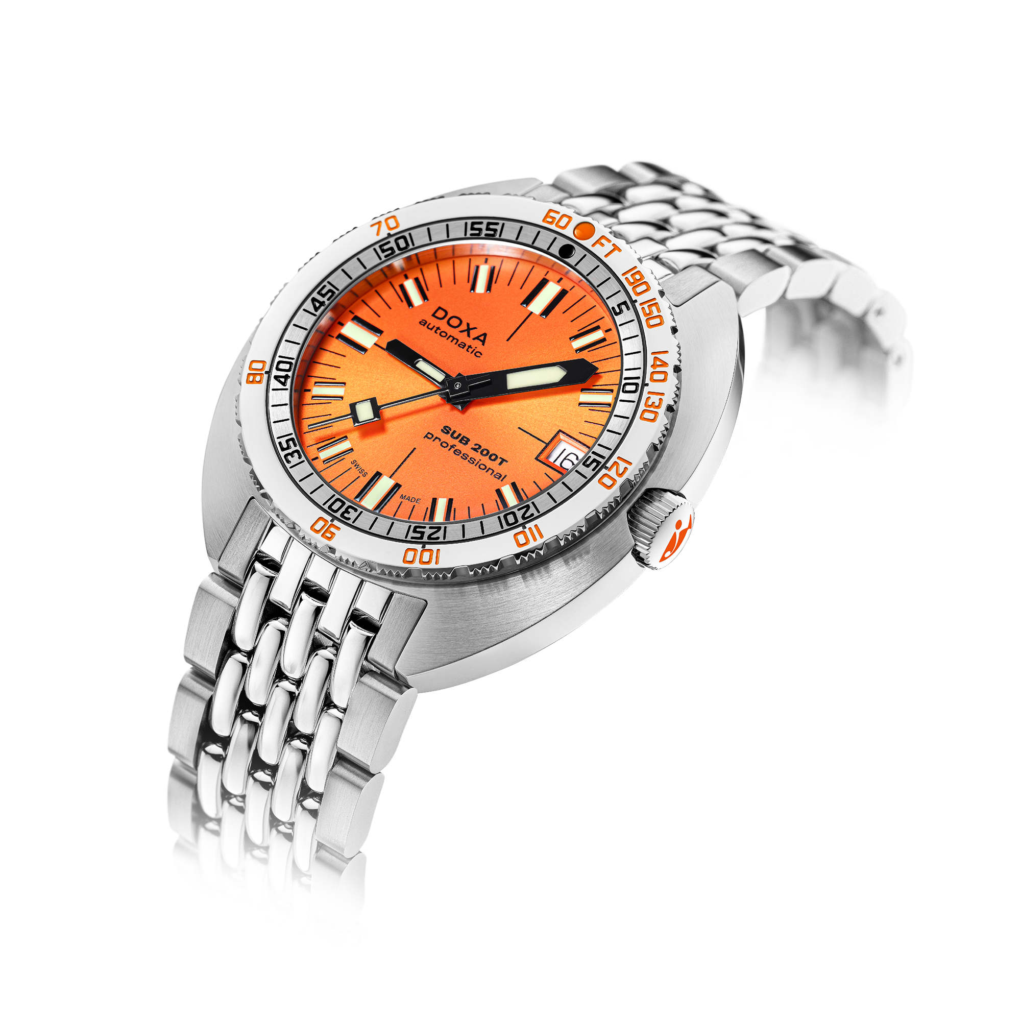 Ref. 804.10.351S.10 - Die neue SUB 200T wirkt mit ihrem kleinen Durchmesser stilistisch moderner und raffinierter, übernimmt aber geschickt die DNA des Originals. Durch die Überarbeitung der Volumina innerhalb des Gehäuses wurde die Reduzierung auf einen eleganten 39-mm-Durchmesser sowie eine angenehmere Höhe von 10,70 mm möglich. Darüber hinaus hat DOXA das Zifferblattdesign optimiert, um eine zeitgemäßere Optik am Handgelenk zu erzielen.