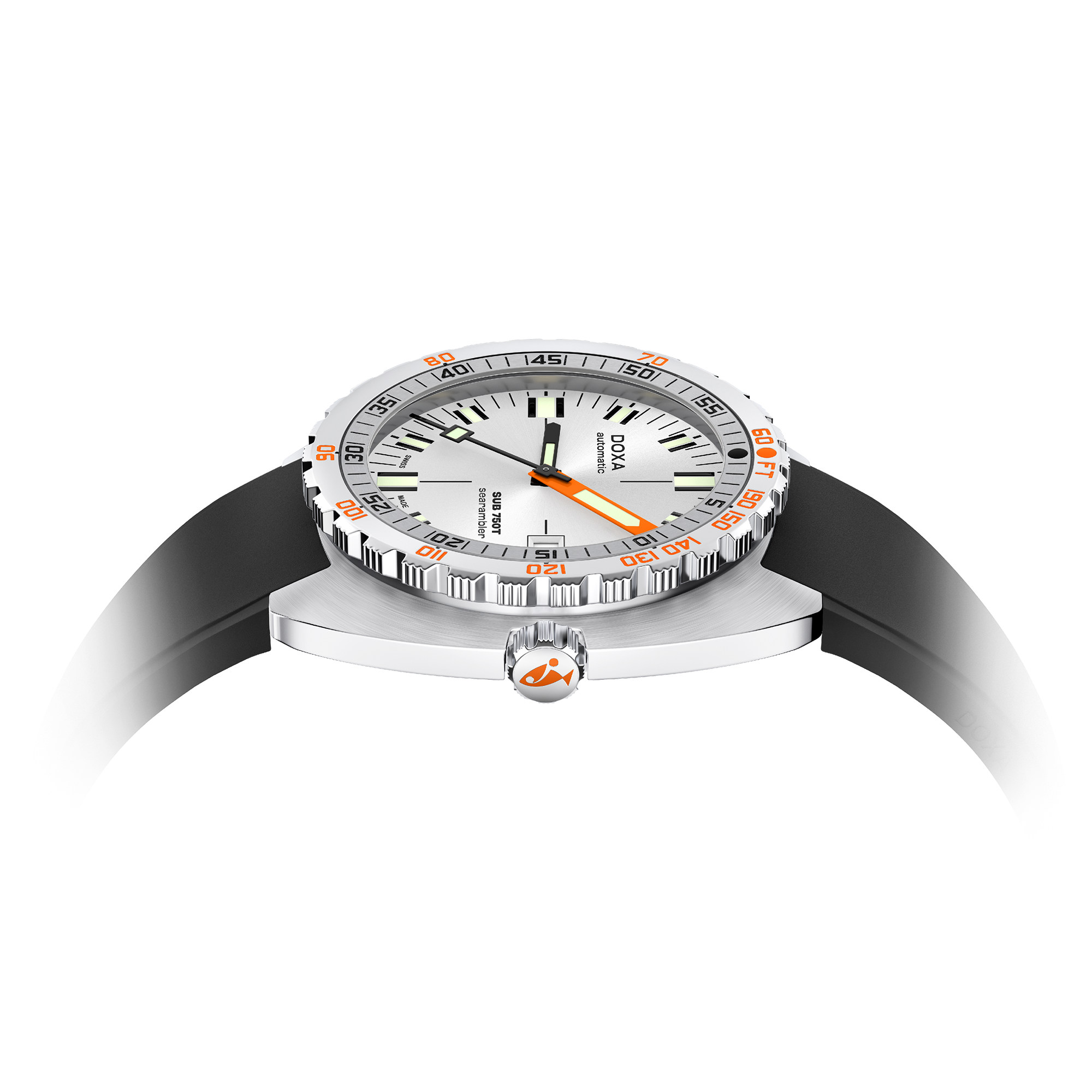 Heute bringt DOXA diese Ikone mit einem vollständig überarbeiteten Design in die Gegenwart. Die neue SUB 750T bewahrt die DNA des Originals mit ihrer markanten Präsenz, kompromisslosen Verarbeitung und robusten Zuverlässigkeit, präsentiert sich jedoch mit einer schlankeren und moderneren Silhouette. Das neu gestaltete Gehäuse bleibt mit 45.00 x 47.00 mm eindrucksvoll, wurde jedoch auf eine Höhe von nur 11,95 mm reduziert, was sie leichter, bequemer und zeitgemäßer macht.