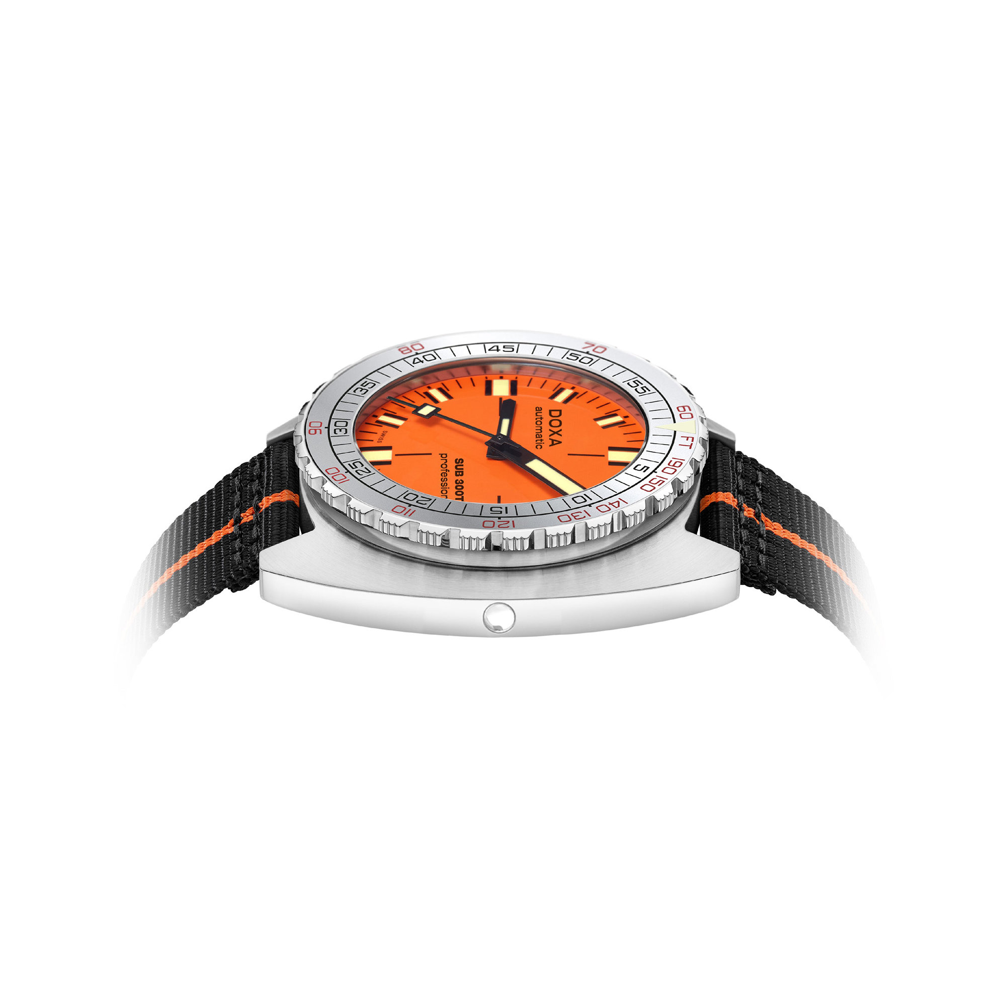 Die SUB 300T Professional Aristera ist ausschließlich mit dem ikonischen orangefarbenen Zifferblatt der DOXA-SUB-Modelle erhältlich, das ihre Abstammung unverkennbar macht. Dieses Modell bietet sowohl das legendäre Reiskorn-Armband aus Edelstahl, passend zum Gehäuse, als auch das lässige und leichtere NATO-Armband. Beide Armbandvarianten verfügen über eine Edelstahlschließe.