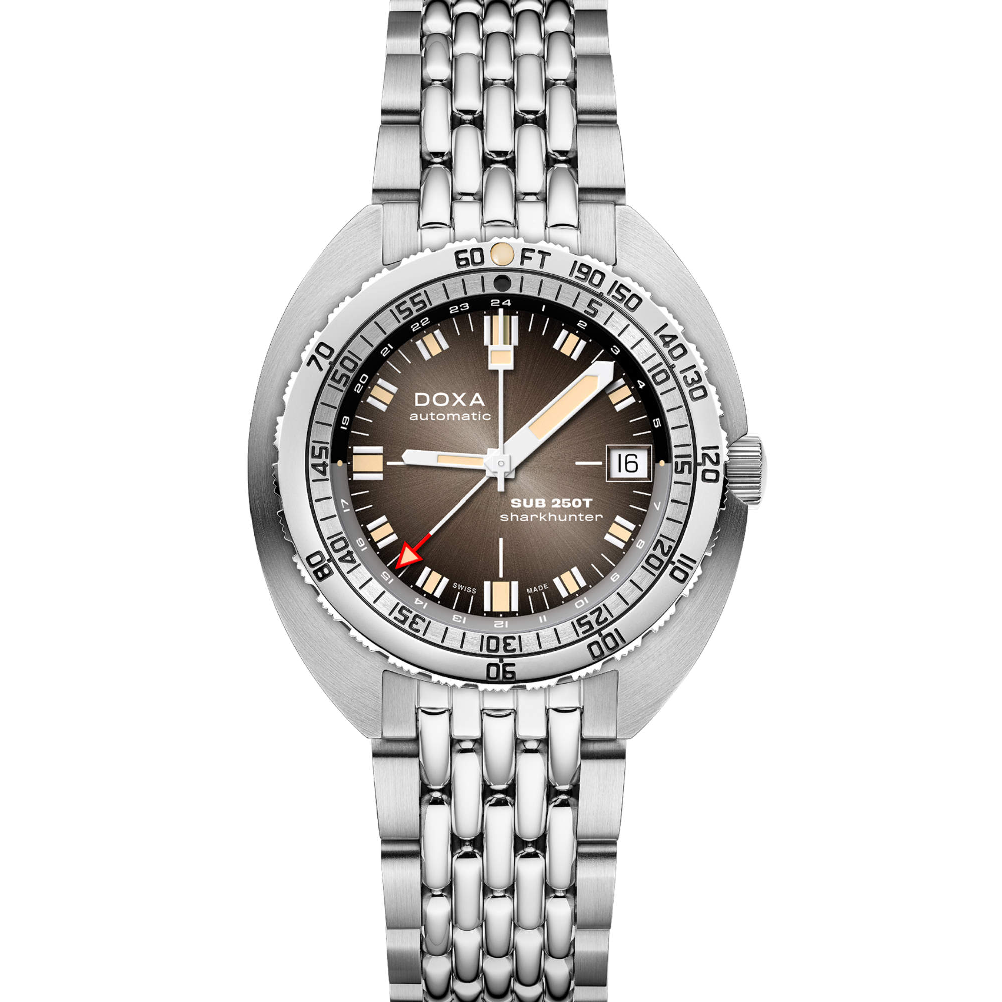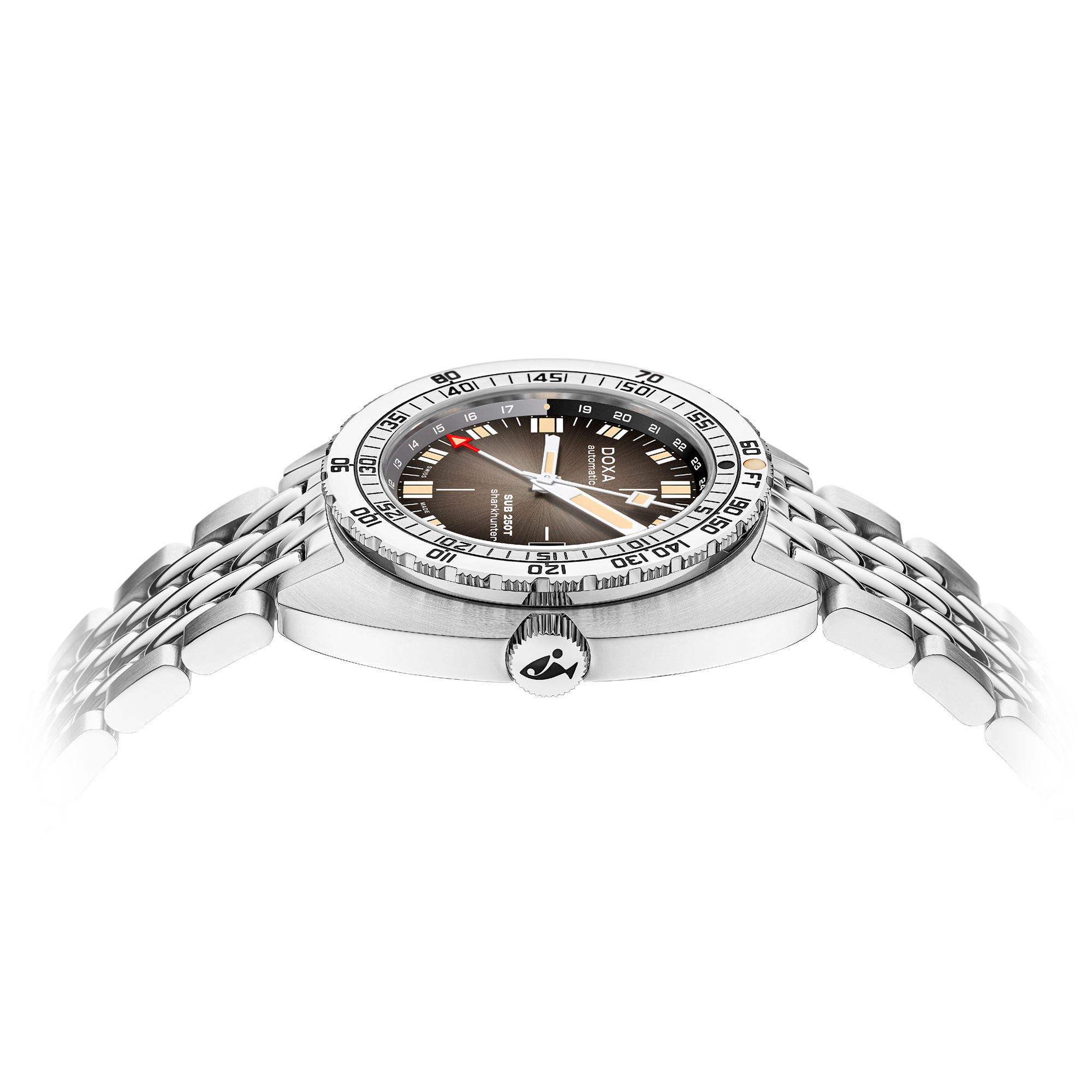Ref. 855.10.101V.10 - Die SUB 250T GMT markiert DOXAs Rückkehr zur GMT-Funktion und vereint die Robustheit einer Taucheruhr mit der Weltzeitfunktion. Ihr 40-mm-Gehäuse aus Edelstahl bietet die perfekte Balance zwischen Präsenz am Handgelenk und Tragekomfort, während die verschraubte Krone und die einseitig drehbare Lünette mit Tauchskala eine professionelle Leistung gewährleisten. Mit einer Wasserdichtigkeit von 250 Metern (820 Fuß) ist sie sowohl für Unterwasserabenteuer als auch für weltweite Reisen ausgelegt.