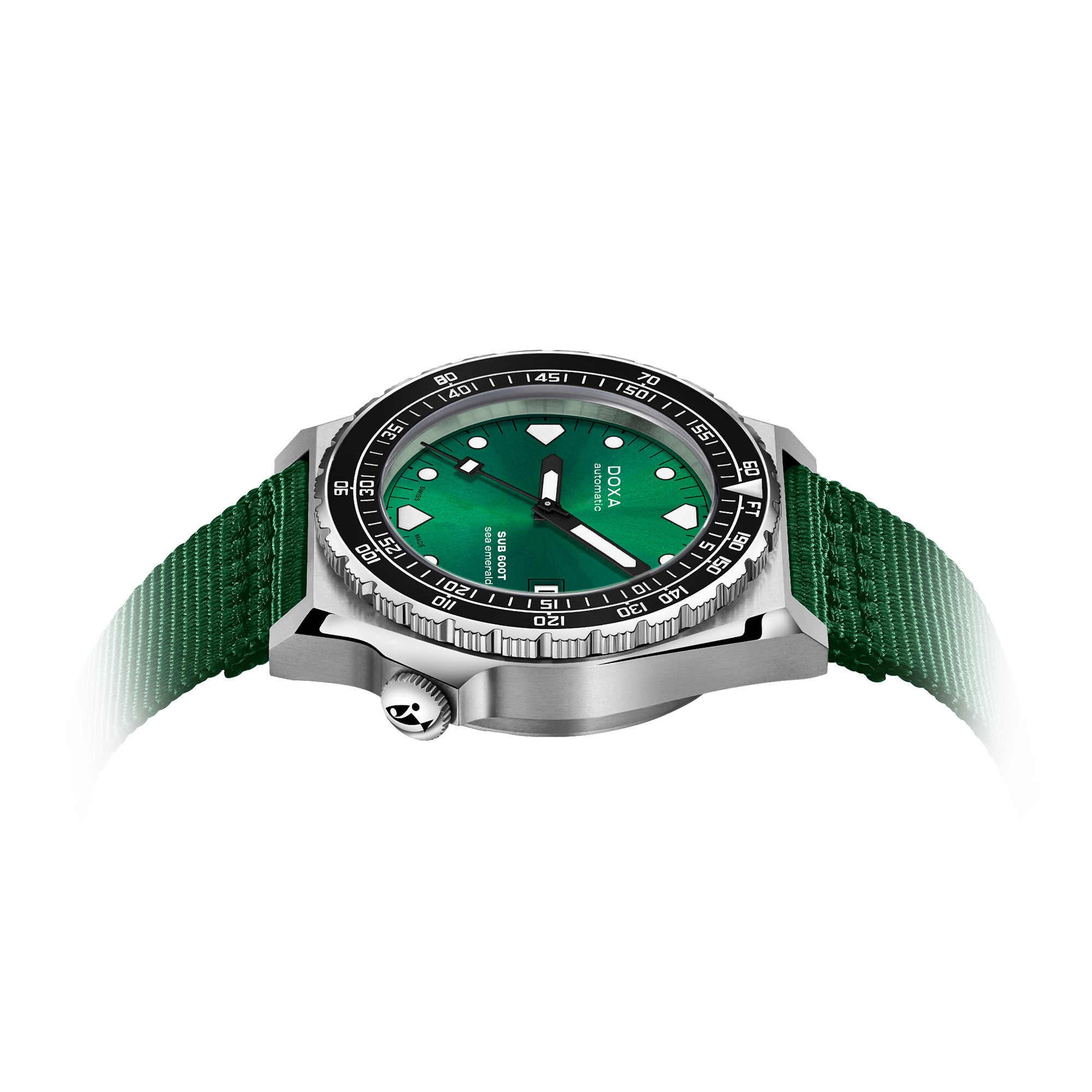 Alle tauchbezogenen Indikationen sind mit leuchtenden Super-LumiNova®-Pigmenten beschichtet, darunter auch die unverwechselbaren Stundenmarkierungen in Form eines Haifischzahns bei 6, 9 und 12 Uhr, für optimale Lesbarkeit unter schlechten Lichtverhältnissen. Zwei Armbänder stehen zur Auswahl: ein NATO-Armband, das Ton in Ton mit der Zifferblattfarbe ausgeführt ist, und ein neues Armband aus Edelstahl 316L, das der DOXA-Kollektion einen „modernen Vintage“-Touch verleiht. Das NATO-Armband verfügt über eine Dornschliesse für eine bequeme und komfortable Anpassung an das Handgelenk des Trägers sowie über Schnellwechsel-Federstege.