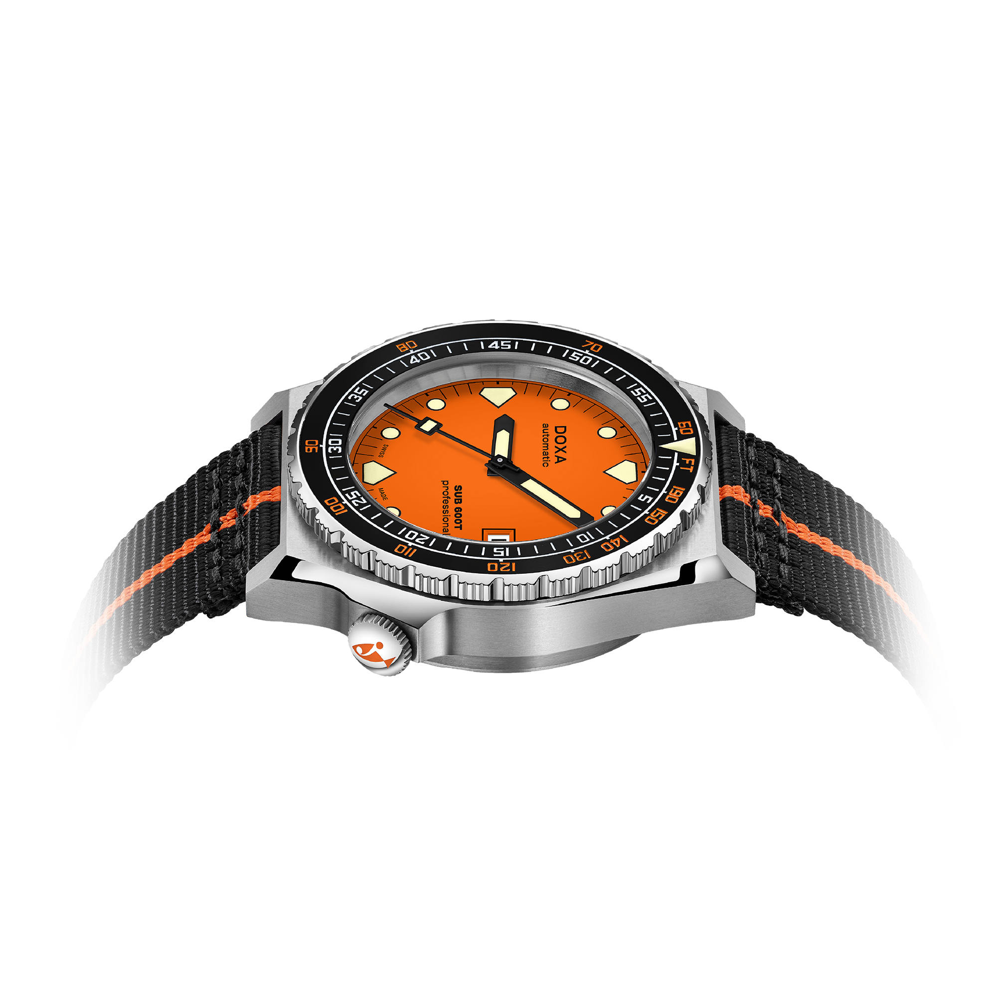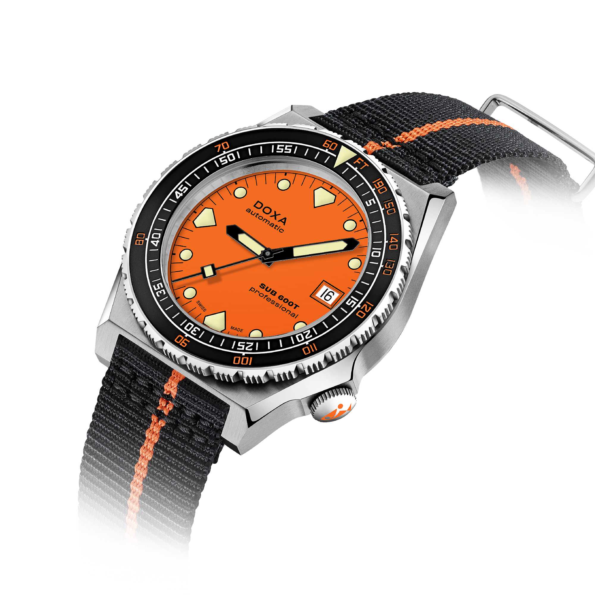 Alle tauchbezogenen Indikationen sind mit leuchtenden Super-LumiNova®-Pigmenten beschichtet, darunter auch die unverwechselbaren Stundenmarkierungen in Form eines Haifischzahns bei 6, 9 und 12 Uhr, für optimale Lesbarkeit unter schlechten Lichtverhältnissen. Zwei Armbänder stehen zur Auswahl: ein NATO-Armband, das Ton in Ton mit der Zifferblattfarbe ausgeführt ist, und ein neues Armband aus Edelstahl 316L, das der DOXA-Kollektion einen „modernen Vintage“-Touch verleiht. Das NATO-Armband verfügt über eine Dornschliesse für eine bequeme und komfortable Anpassung an das Handgelenk des Trägers sowie über Schnellwechsel-Federstege.