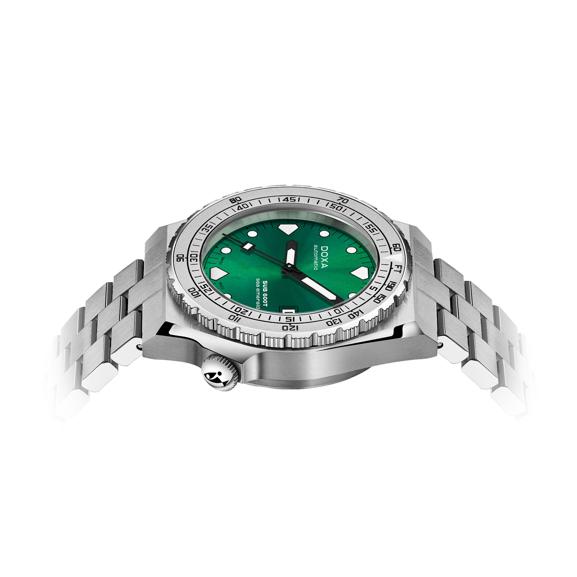 Alle tauchbezogenen Indikationen sind mit leuchtenden Super-LumiNova®-Pigmenten beschichtet, darunter auch die unverwechselbaren Stundenmarkierungen in Form eines Haifischzahns bei 6, 9 und 12 Uhr, für optimale Lesbarkeit unter schlechten Lichtverhältnissen. Zwei Armbänder stehen zur Auswahl: ein NATO-Armband, das Ton in Ton mit der Zifferblattfarbe ausgeführt ist, und ein neues Armband aus Edelstahl 316L, das der DOXA-Kollektion einen „modernen Vintage“-Touch verleiht. Das NATO-Armband verfügt über eine Dornschliesse für eine bequeme und komfortable Anpassung an das Handgelenk des Trägers sowie über Schnellwechsel-Federstege.