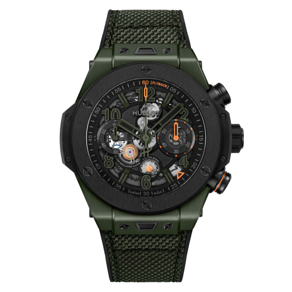 Schwarzes Kautschukarmband mit dunkelgrünem Stoff und Faltschließe aus schwarzer Keramik und Titan