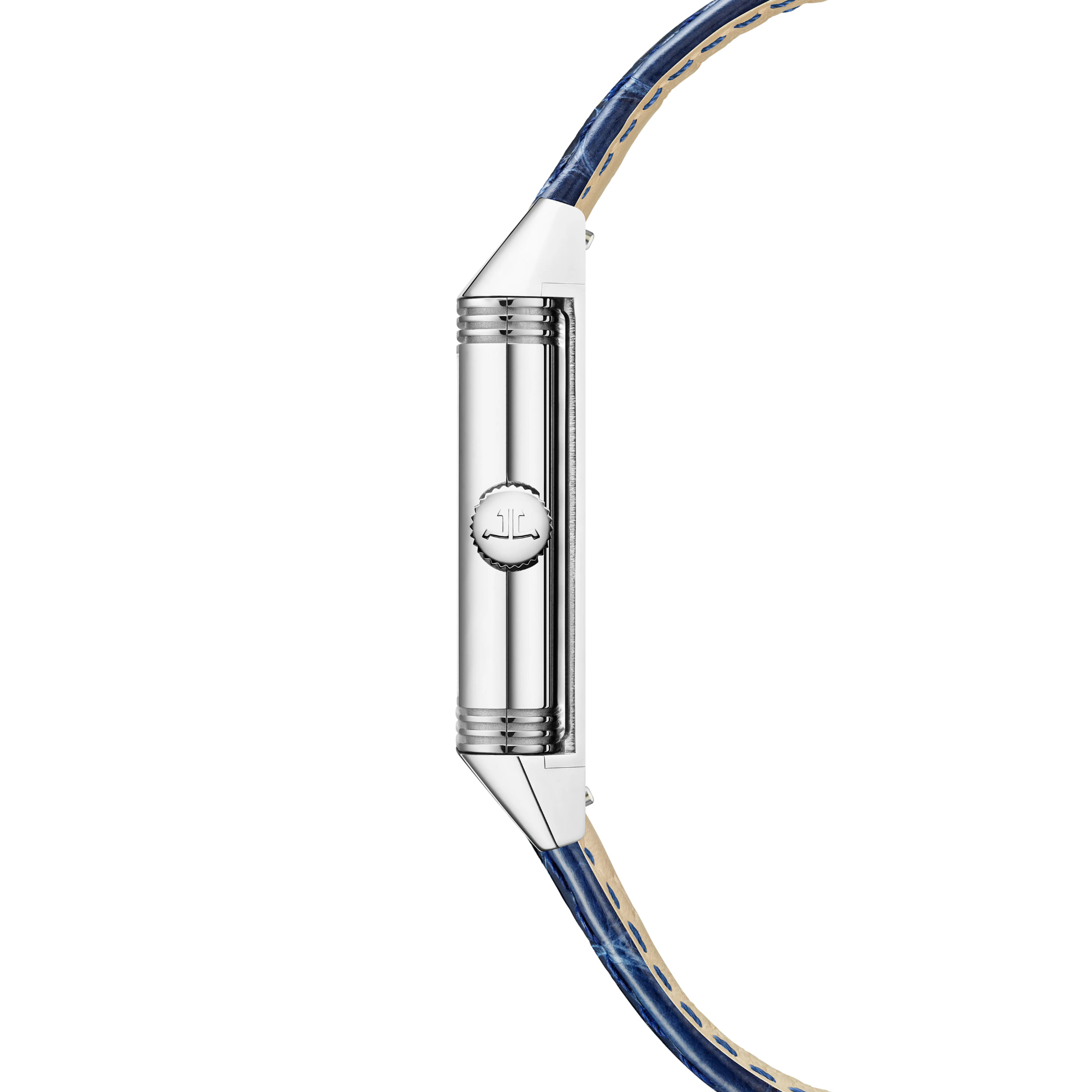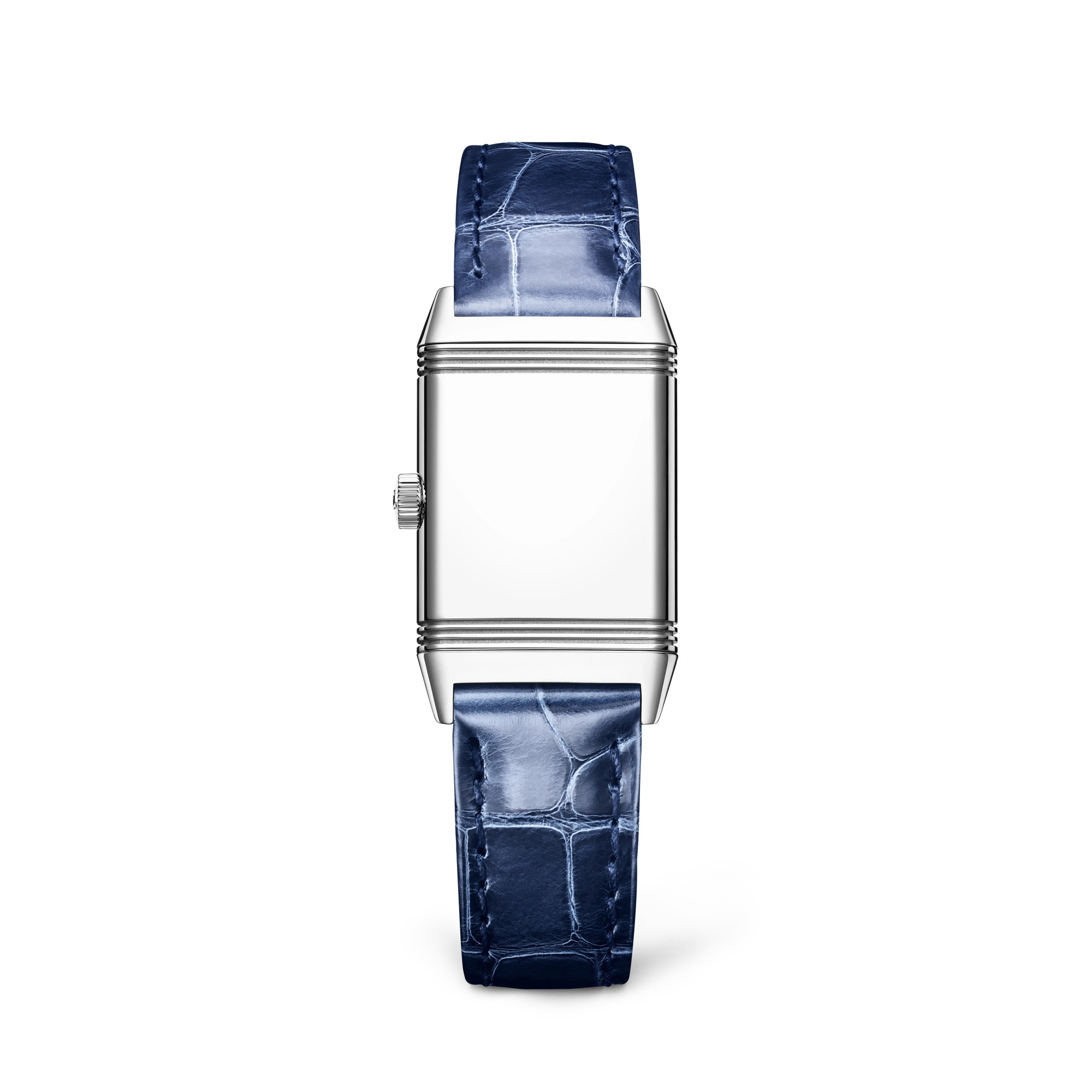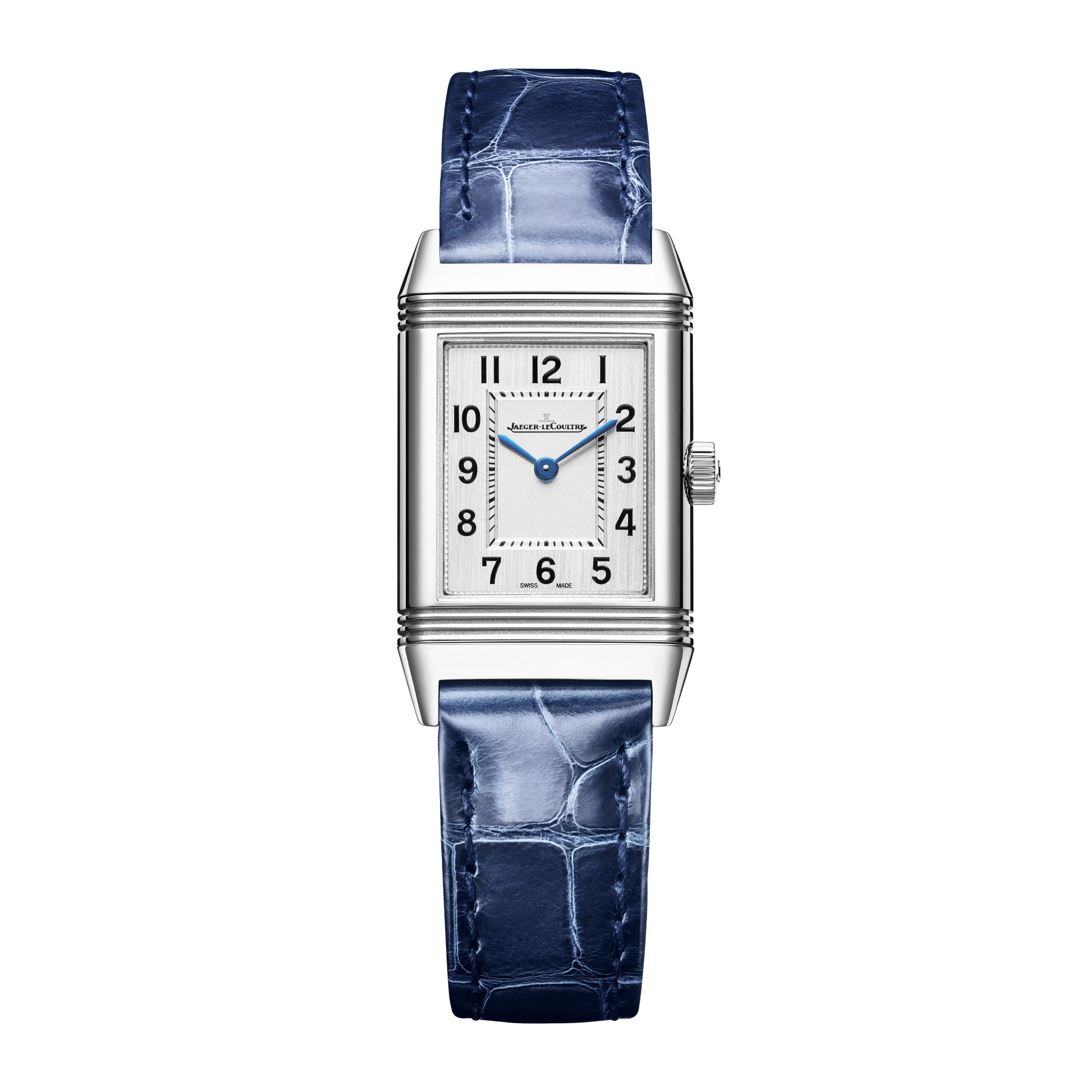 Ref. Q2618541 - Die legendären ästhetischen Codes des Art déco Stils und die Attribute der klassischen Reverso werden auch in dieser Reverso Classic Small aus Edelstahl wiederaufgenommen. Vollendet wird die Uhr durch ein elegantes blaues Lederarmband, das je nach Wunsch an die Tages- oder Nachtzeit angepasst werden kann. Dank perfekter Proportionen und Symmetrie ist dieses feminine Modell ebenso klassisch wie zeitlos. Seine pure Raffinesse manifestiert sich unter anderem durch sein dezentes vertikales Satinzifferblatt mit opalisierendem Mittelpunkt.