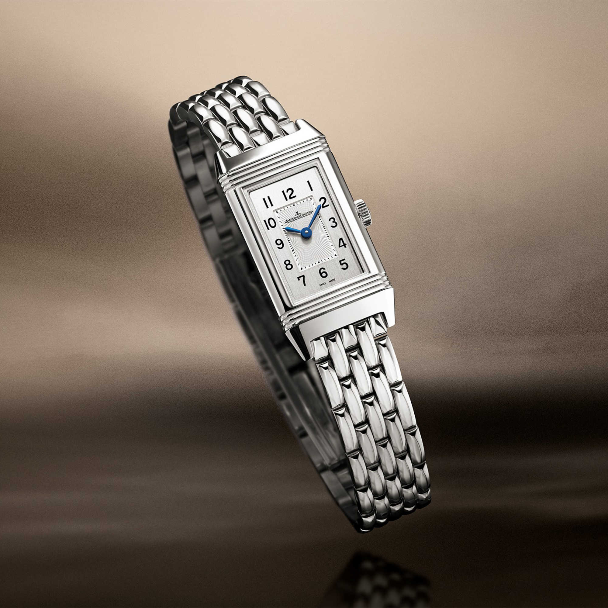 Ref. Q3878120 - Die Reverso Classic Monoface Origin greift das dezente Design der ersten Damenmodelle aus den 1930er-Jahren auf. Die gebläuten Dauphine-Zeiger setzen sich elegant von dem monochromen Hintergrund ab. Das Zifferblatt mit doppelter Guillochierung und vertikal gebürsteter Oberfläche vereint die charakteristischen Art déco-Designelemente der Reverso: Godrons am auf beiden Seiten des Edelstahlgehäuses, ein Minutenring im Zentrum und arabische Ziffern. Die Rückseite bietet die Möglichkeit zur individuellen Gravur und Lackierung. Das elegante Edelstahl-Gliederarmband vervollständigt den zeitlosen Charakter dieses Zeitmessers.
