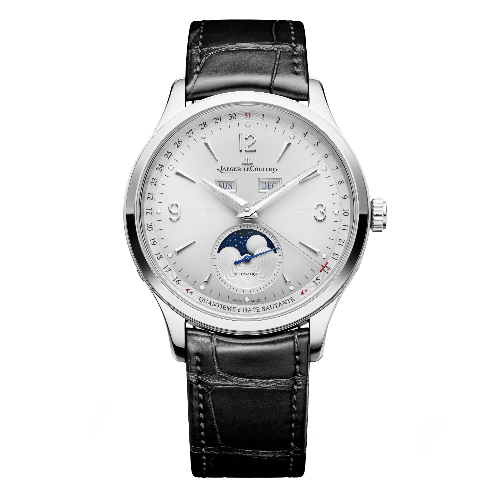 Ref. Q4148421 - Die neue Master Control Calendar bietet die uhrmacherische Komplikation der Mondphase sowie eine springende Datumsanzeige, die zwischen dem 15. und 16. des Monats wechselt. Dieser Mechanismus ist eine Neuheit in der Master Control Kollektion und sorgt dafür, dass Sie die Mondphase stets im Blick haben, die sich in einem Fenster bei sechs Uhr befindet. Diese Version der Master Control Calendar aus Edelstahl mit dem perfekt dazu passenden silbernen Zifferblatt mit Sonnenschliff verfügt über einen vollständigen Kalender. Unter einem Saphirglasboden auf der Rückseite der Uhr zeigen sich die Komponenten des Kalibers der nächsten Generation, das eine Gangreserve von 70 Stunden verspricht.