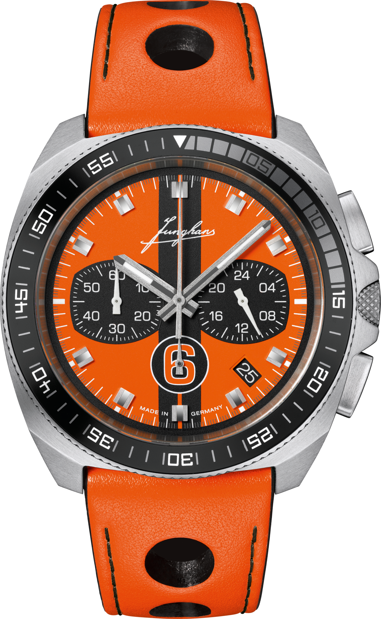 Ref. 41/4560.00 - Die Liebe zum Sport im Allgemeinen und die Sportzeitmessung im Besonderen haben bei Junghans eine lange Tradition. Das begann in den 1920er-Jahren mit den ersten Handstoppuhren und setzte sich mit der Zeitmessung vielzähliger Sportwettkämpfe fort, deren Höhepunkt 1972 in München war. Die limitiere 1972 Chronoscope Sports Edition 2026 trägt einen markanten Doppelstreifen, den historischen Junghans-Schriftzug sowie die Ziffer 6 in Form einer Startnummer. Das Modell ist auf 200 Uhren limitiert.