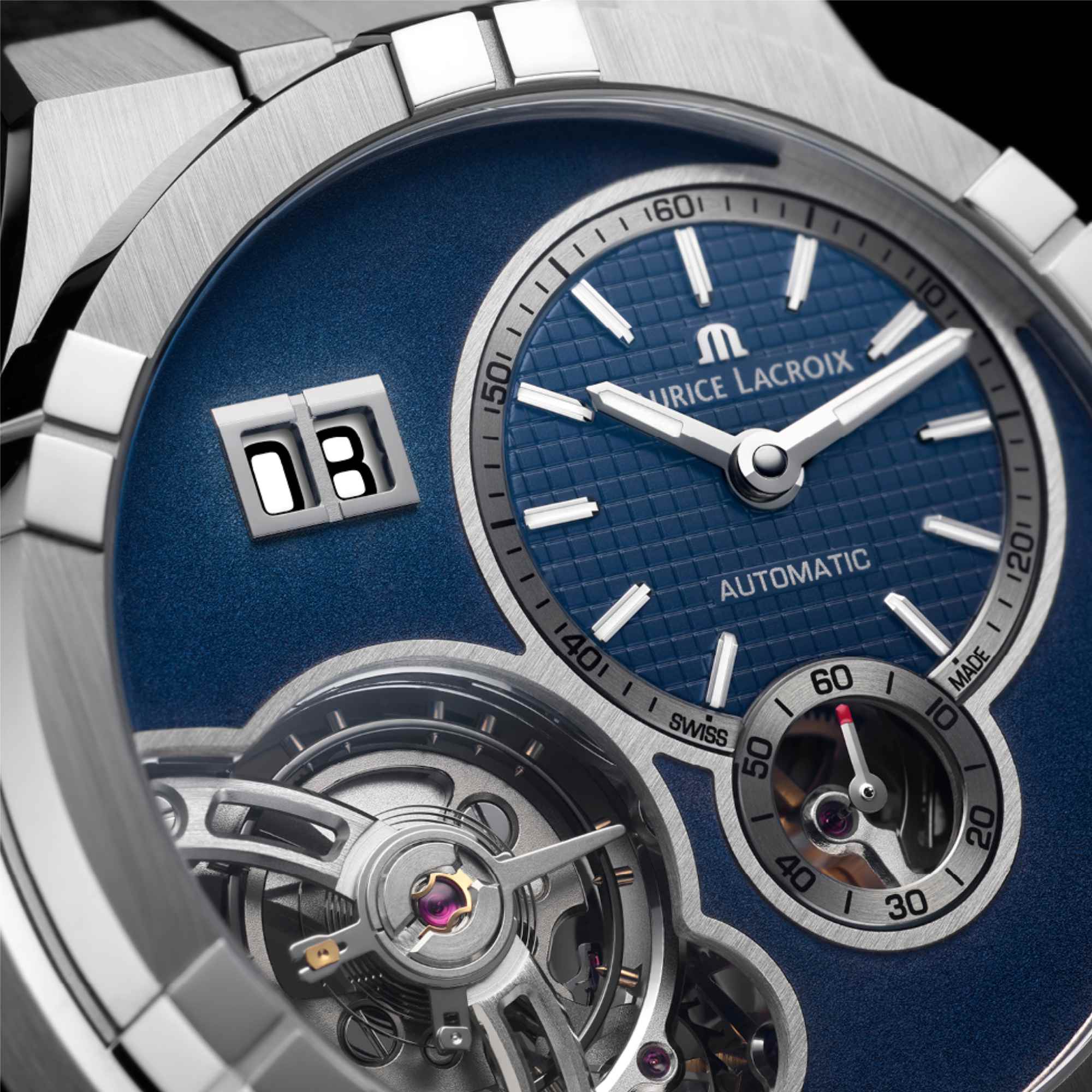 Vertikal gebürstete und gekörnte Zifferblattplatte mit blauer PVD-Beschichtung, Unruhbrücke aus Rhodium mit Sonnenschliff, sonstiges Rhodium sandgestrahlt, skelettierte Schwungmasse, gebürstet und azuriert