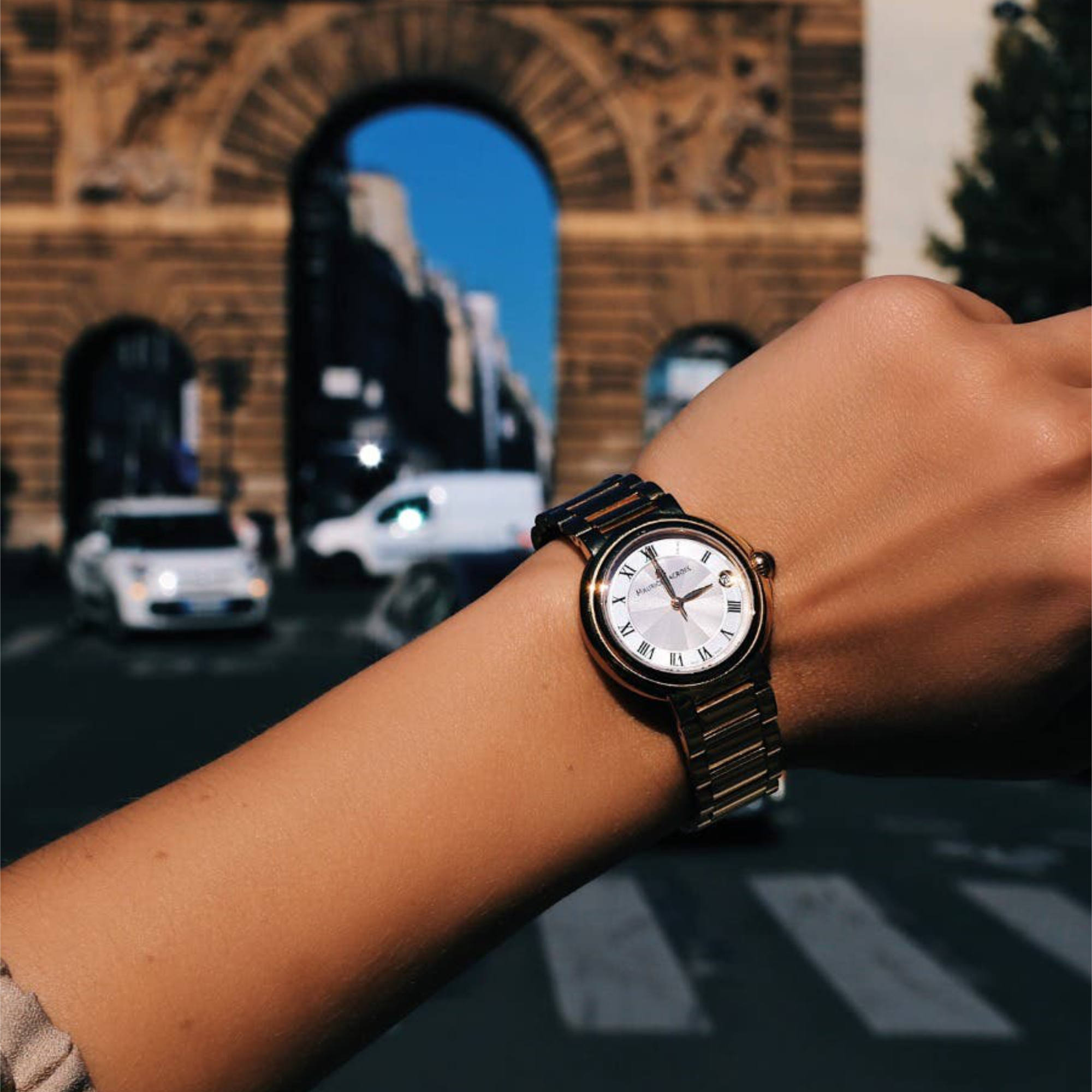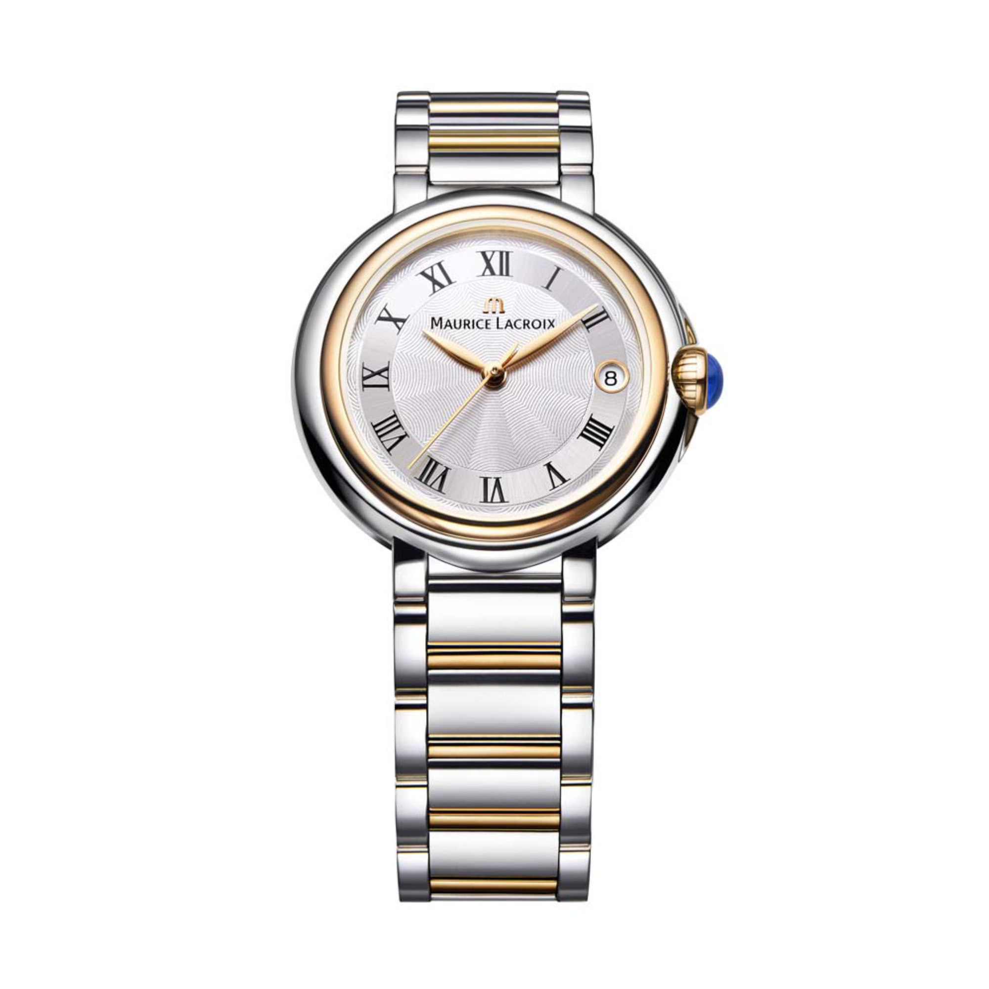 Silberfarben mit guillochierten „Wassertropfen“-Motiv und Römischen Ziffern
