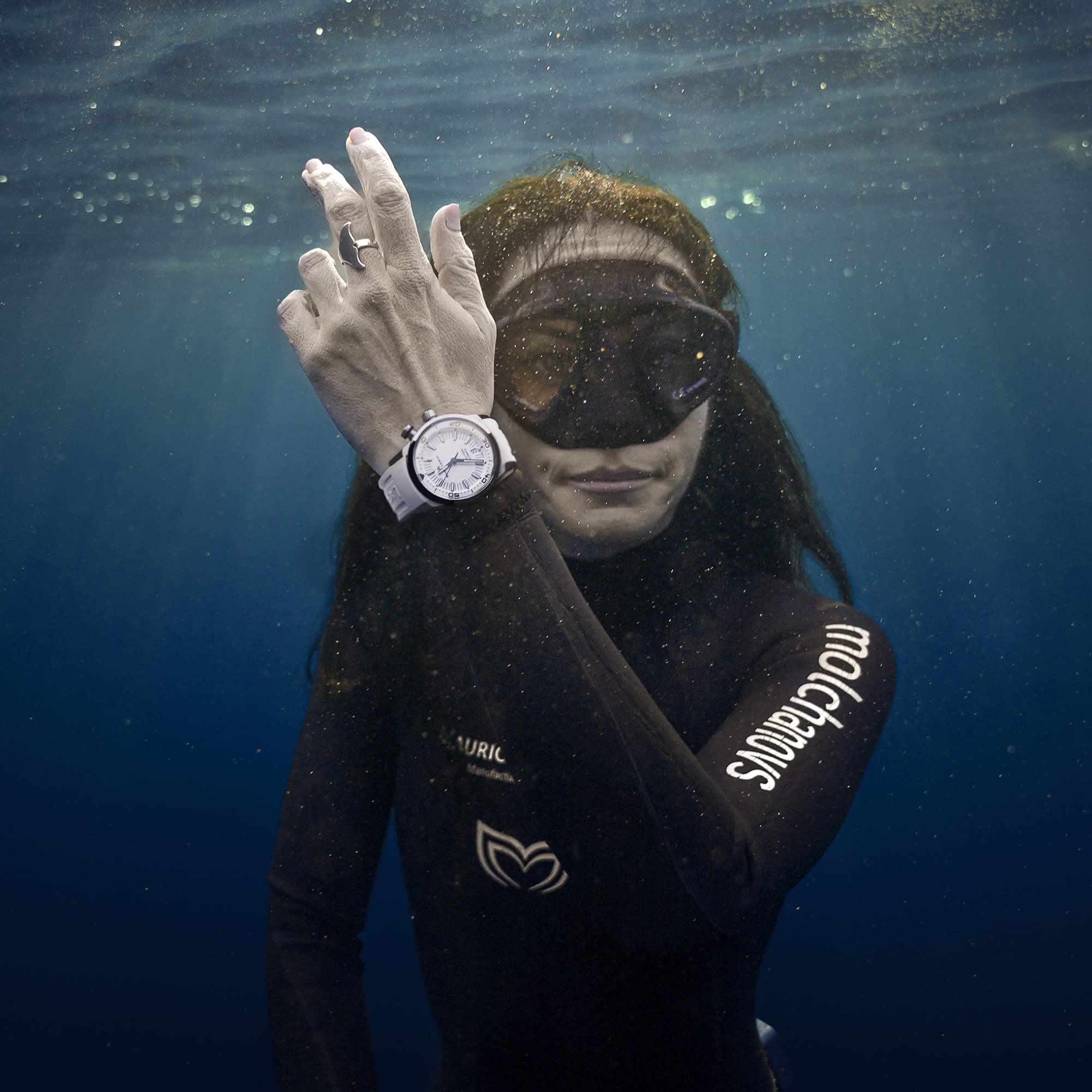 Weiß lackiertes Zifferblatt mit blauen Spitzen, rhodiniertem M-Logo aus Gold