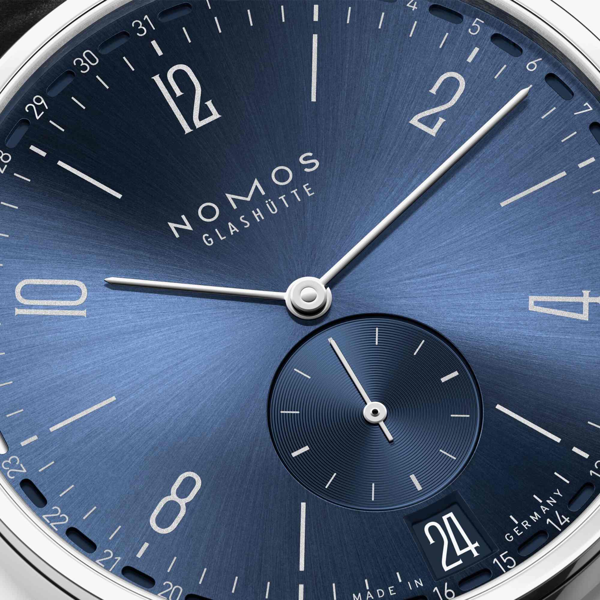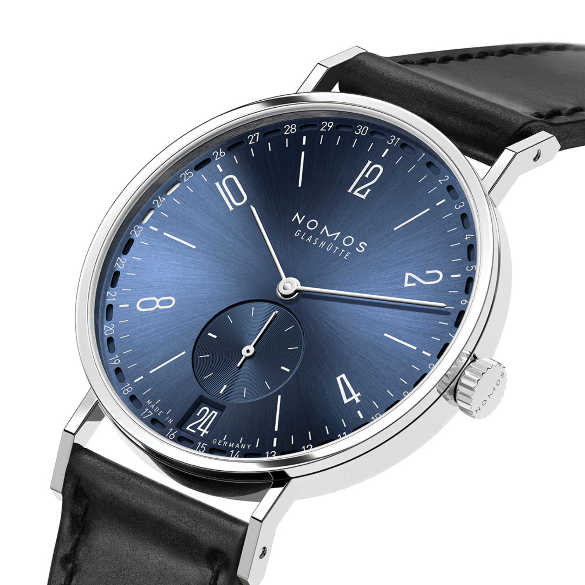 Ref. 136 - Wegweisend: Zwei Markierungen rahmen beim umlaufenden NOMOS-Ringdatum den aktuellen Tag ein. Auf dem tiefblauen Zifferblatt mit silberfarbenen Ziffern und Indexen sind sie weiß – wie das Datum im zusätzlichen Fenster auf 6 Uhr. Die zweifache Datumsanzeige bewahrt Blick aufs Ganze und fokussiert gleichzeitig das Detail. Tangente 2date ist das erste Handaufzugsmodell, das über das exklusive Ringdatum verfügt. Und etwas zarter als das neomatik-Update-Modell: der Gehäusedurchmesser beträgt 37,5 Millimeter.